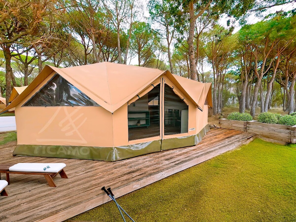 Böyük örtülü verandalı lüks qlempinq çadırımız mərkəzdə qəbul, üzgüçülük hovuzu, restoran və tualet binasının yaxınlığındakı düşərgədə yerləşir. Bütün bunlar 50 metrdən azdır. Çadırda 2 yataq otağı, 150-179 sm ölçülü çarpayı və çoxmərtəbəli çarpayı, duş, tualet, qonaq otağı və yemək masası və ya istirahət dəstində qəlyanaltı və içki içərək dincələ biləcəyiniz örtülü veranda var. Restoranlara, kəndə və çimərliyə yaxın, mükəmməl mövqe.