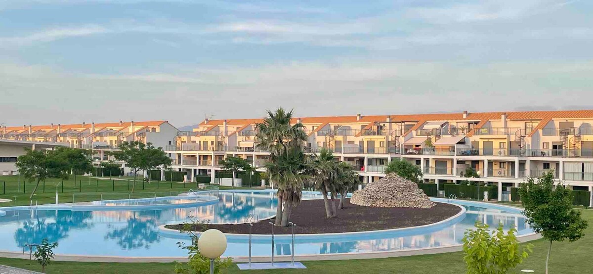 VT-41644-CS9 Piscina de ensueño, paddle, tenis, futbito, ping-pong, parque infantil… El apartamento cuenta con lo necesario para no aburrirte: juegos, libros, tv, raquetas, pelotas y proyector de cine. Frente al campo de golf y rodeado de campos, zona muy tranquila. Senderos para pasear. Bonitos atardeceres Vinaròs a 11km, Peñíscola a 20km, Delta del Ebro a 35km, Morella a 42km, Port aventura a 89 km…