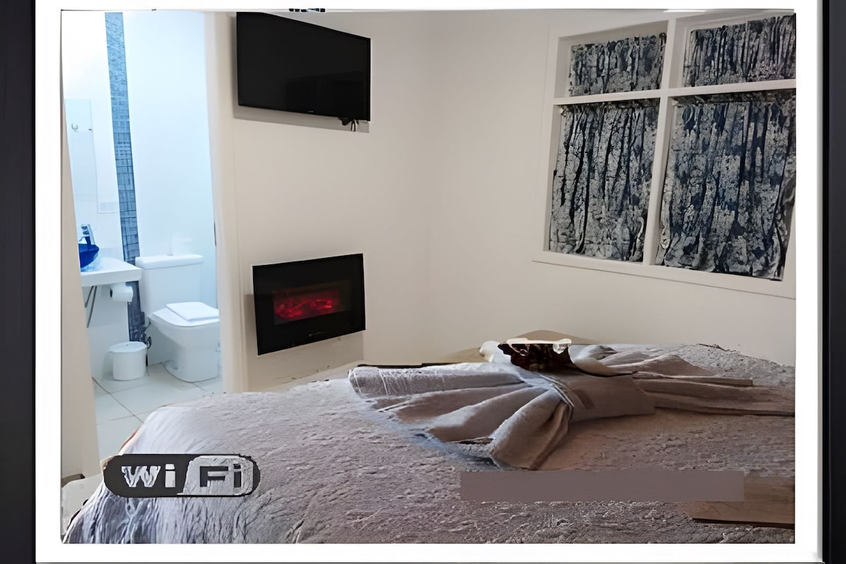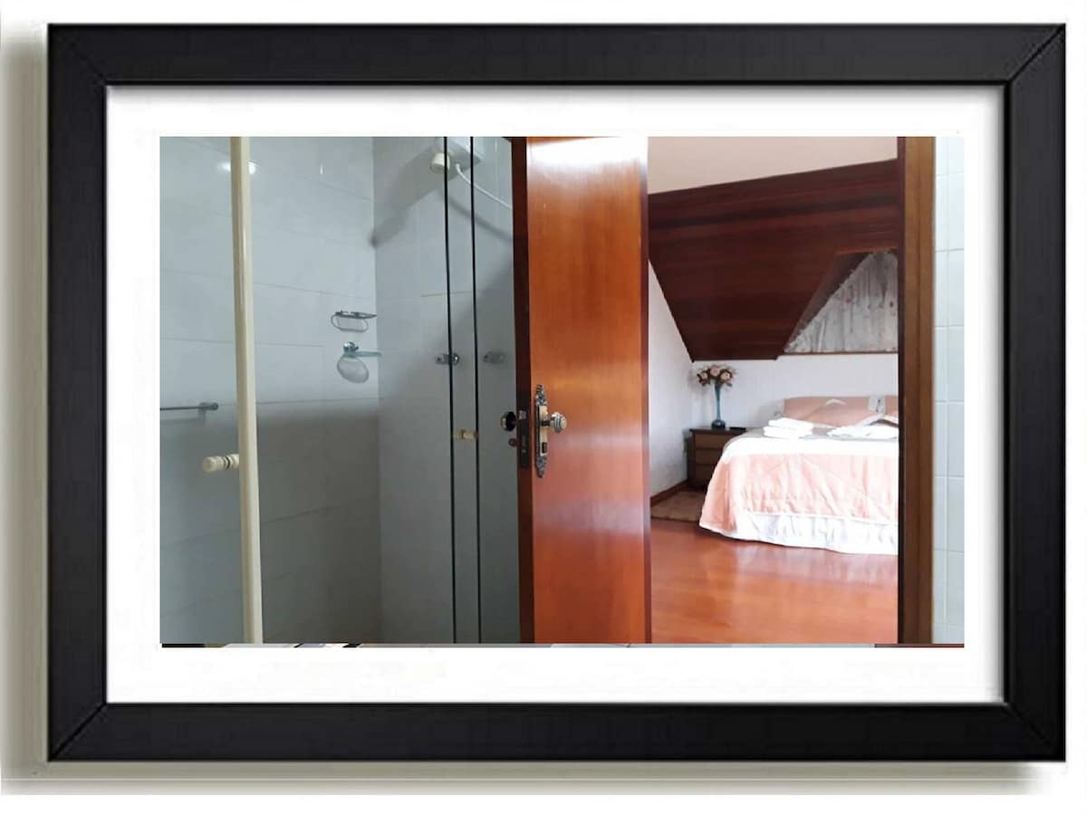SUÍTE CASAL .. geminado com nossa casa, equipado com: 🔹Lareira a gás 🔹TV Smart de 32" 🔹Frigobar 🔹Microondas , bebedouro e pia na área comum 🔹taças , pratos e talheres 🔹check-in 15:00h e check-out 12:00 🔹Cama Casal com colchão terapêutico com massagem 🔹Wi-Fi 🔹TV a cabo 🔹chuveiro a gás 🔹secador de cabelo 🔹Roupas de cama e banho 🔹Rede privativa 🔹Estacionamento fechado com portão automático 🔹Fogareiro para mashmalow (Não incluso lenha) 🔹 Não fornecemos serviço quarto