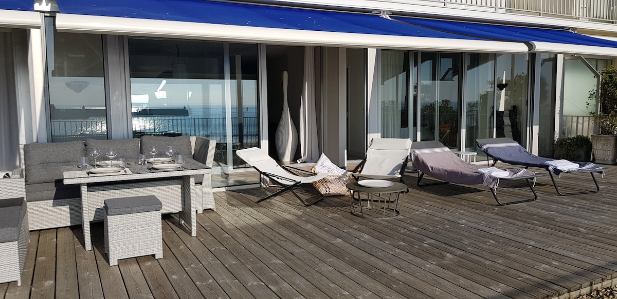 4 nəfərlik çox böyük, geniş və işıqlı mənzil (130m2) yenicə təmir edilmiş və bəzədilmiş (130m2), tam dəniz mənzərəsi, tam ayaq, cənubda böyük çimərliyə baxan, mağazalara (çörək zavodu, supermarket, kinoteatr, velosiped icarəsi) yaxın Göyərtə,günəş vannası qəbul etmək və bağ mebeli ilə təchiz edilmiş terras(90 m2), Terras girişi olan böyük qonaq otağı, 1 dəniz mənzərəli, təchiz olunmuş mətbəx, duş kabinəsi olan hamam otağı, ayrıca tualet, camaşırxana, paltardəyişmə otağı daxil olmaqla 2 yataq otağı Xüsusi giriş Parkinq yeri Velosipedlə yerli