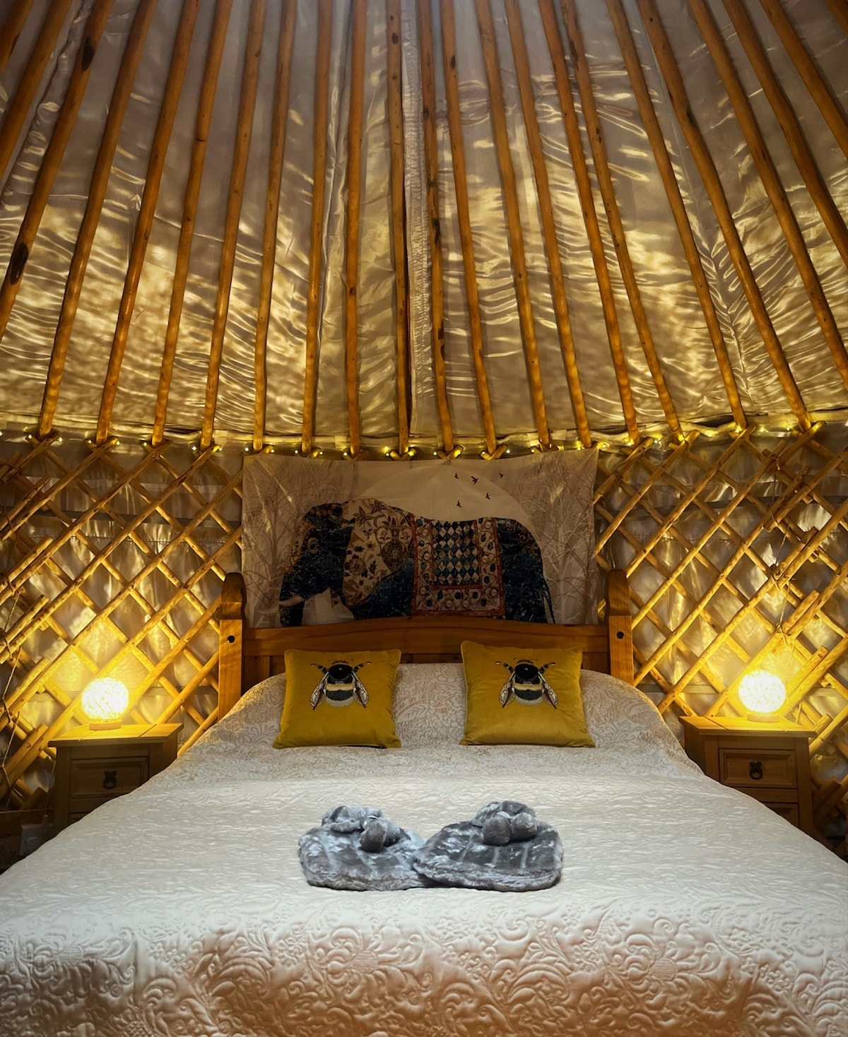 Goytree Glamping and Treehouses - Gabriels Yurt: Rahat olun və təbiət məkanına geri dönən bu rustik ucsuz-bucaqsız yerə yerləşin. Biri yataq otağı, digəri isə mətbəx olan bu gözəl ikiqat alaçıq sehrli, tənha bir yerdə qurulub, ucsuz-bucaqsız çəmənliklərin həyat boyu artan mənzərələri və Qara Dağların əzəmətli arxa tərəfi var. Həqiqətən yaddaqalan təcrübə olan qəribə odun atəşli vannadan ulduzlardan və bayquşlardan zövq alın. Romantik istirahət yerləri, itlərlə tətillər və ya gəzinti tətilləri üçün baza üçün mükəmməldir.