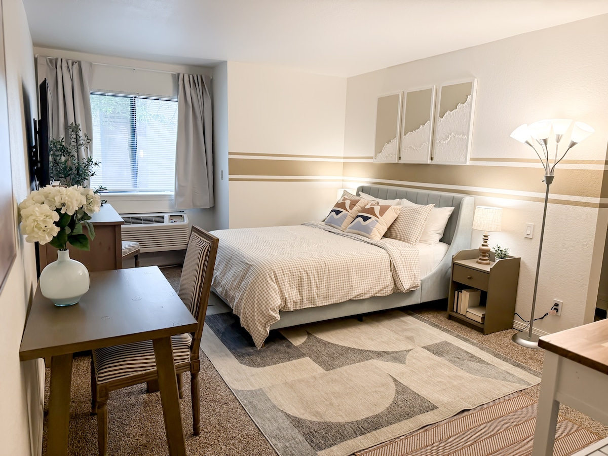 Bu düşünülmüş dizaynlı məkan şəhərin mərkəzində yerləşir və premium döşəyi və təzə yataq dəsti ilə iki nəfərin rahat yatması üçün queen ölçülü çarpayı təklif edir. Təmiz dəsmallar və əsas tualet ləvazimatları ilə təchiz olunmuş hamam-tualetin, eləcə də geniş duş kabininin rahatlığından zövq alın. Televizor və yemək sahəsi ilə dincəlin və ya mini soyuducu, mikrodalğalı soba, toster, Keurig və kiçik çanaq olan yaxşı təchiz olunmuş mətbəxdə tez bir yemək hazırlayın. Həm qısa tətillər, həm də daha uzunmüddətli qonaqlamalar üçün mükəmməldir.