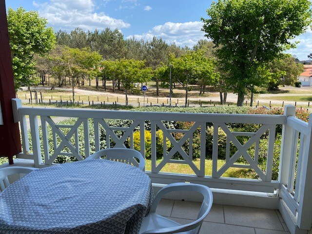 Au pied du Golf et des plages : appt 3 pièces duplex 2 à 6 pers. avec séjour, cuisine équipée, salle d'eau avec WC, chambre lit double, cabine 2 couchages, sdb avec WC. Actuellement en travaux : façade et peintures extérieures. Le plus : TV, Wifi, lave-vaisselle, piscine chauffée (selon saison) activités de loisirs (golf, surf, vélo). Linge de lit sur demande (sup. 40€). Terrasse vue pinède, parking gratuit. La résidence se situe au coeur de la pinède avec vue sur le golf et accès à la plage.