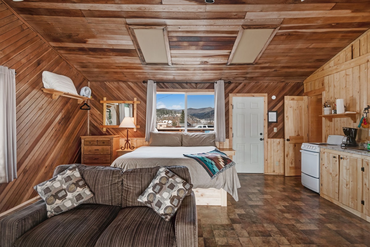 New glass front barrel sauna on our remodeled deck, no pet fees in our locally hosted, dog friendly cabin that’s clean and inviting! Only five miles from Creede, the access is easy but you’ll feel remote and private. Explore these pristine mountains staying only minutes from the continental divide where peace IS quiet. We offer true fiber internet, private creek fishing, clean accommodations, and a relaxing location with incredible views! Hiking trails leave from here!