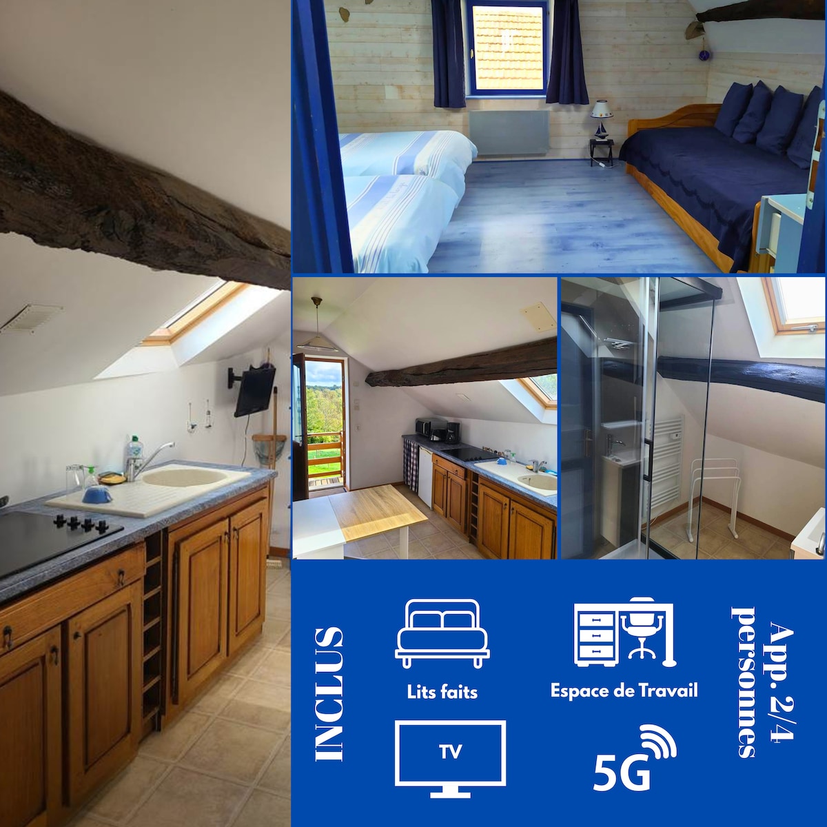 Au coeur de la campagne creusoise , charmant appartement de 50m2 attenant à notre maison , au calme , comprenant 2 chambres . Magnifique vue sur piscine dans un cadre reposant . Piscine ouverte du 1er juin au 1er octobre . Pour votre détente, une séance spa nordique est incluse durant votre séjour. Vous pouvez prolonger le plaisir avec des sessions supplémentaires en option. Massages en option Recharge véhicules électriques interdite Sentiers de randonnée proche de l'appartement .