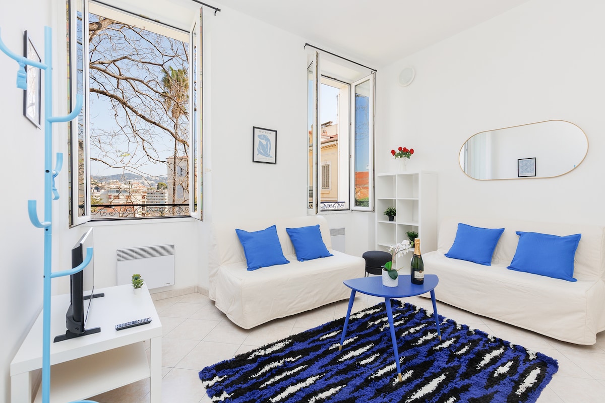 EXCLU AIRBNB! Enjoy a fully renovated, air-conditioned, elegant, and centrally located apartment in a secure residence just 50 meters from the sea. Everything is designed for your comfort. Very convenient location, 300 meters from the convention center, shops, and restaurants, in a luxury residence on the Croisette. You'll enjoy a fully renovated and very practical 38m² apartment with a beautiful, well-equipped kitchen, washing machine, and the ability to sleep 4 people (bedroom + sofa bed).