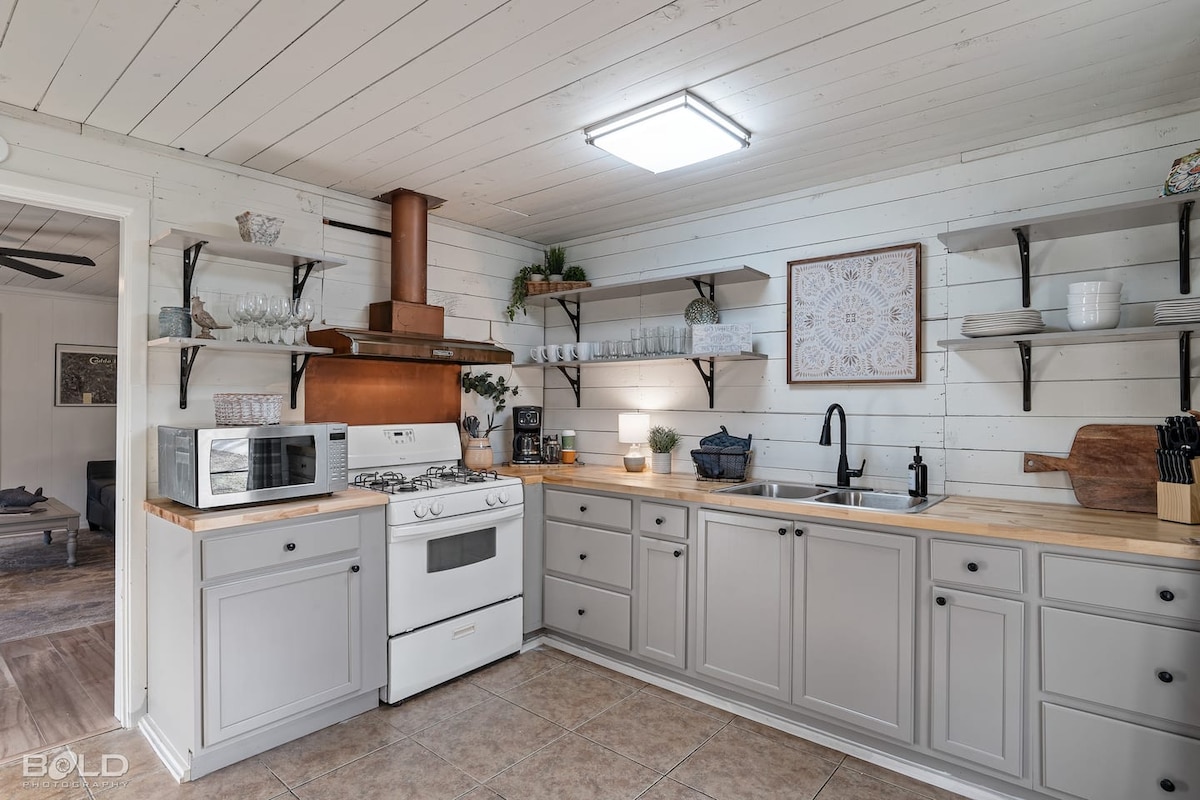 Remodeled kitchen! Butcher block counter, New walk in shower! Relax in this calm, stylish country space. Cabin has lots shade & trees, horseshoes & campfire. Living room has 2 loveseats, one having pull out twin & comfortable leather Chair. Fast Internet, stream favorite TV shows & digital antenna, local 20+ channels. 2 of the bedrooms queen beds, & closets, 3rd bedroom has 1 adult twin bed bunkbed. 4 Wall Air conditioners and radiators in every bedroom living room a/c unit has huge heater too