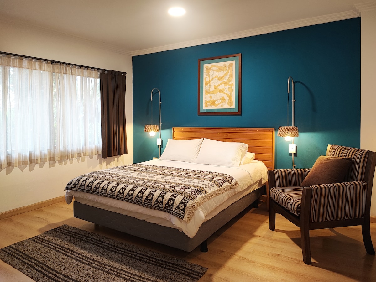 Superior Double Room for 1 to 2 people with a double bed and private bathroom at Pepe's House Cuenca Hotel & Boutique Hostel in Cuenca's Historic Center. Blackout curtains. Buffet breakfast included + free coffee/tea/cookies all day. Free parking from 6 p.m.-8 a.m., TV with children's and family channels. Quiet policy from 11 p.m. to 6 a.m. for a better night's sleep. 13 minutes from the airport. Bilingual receptionists from 7 a.m. to 9 p.m., and free luggage storage (for check-in and check-out)
