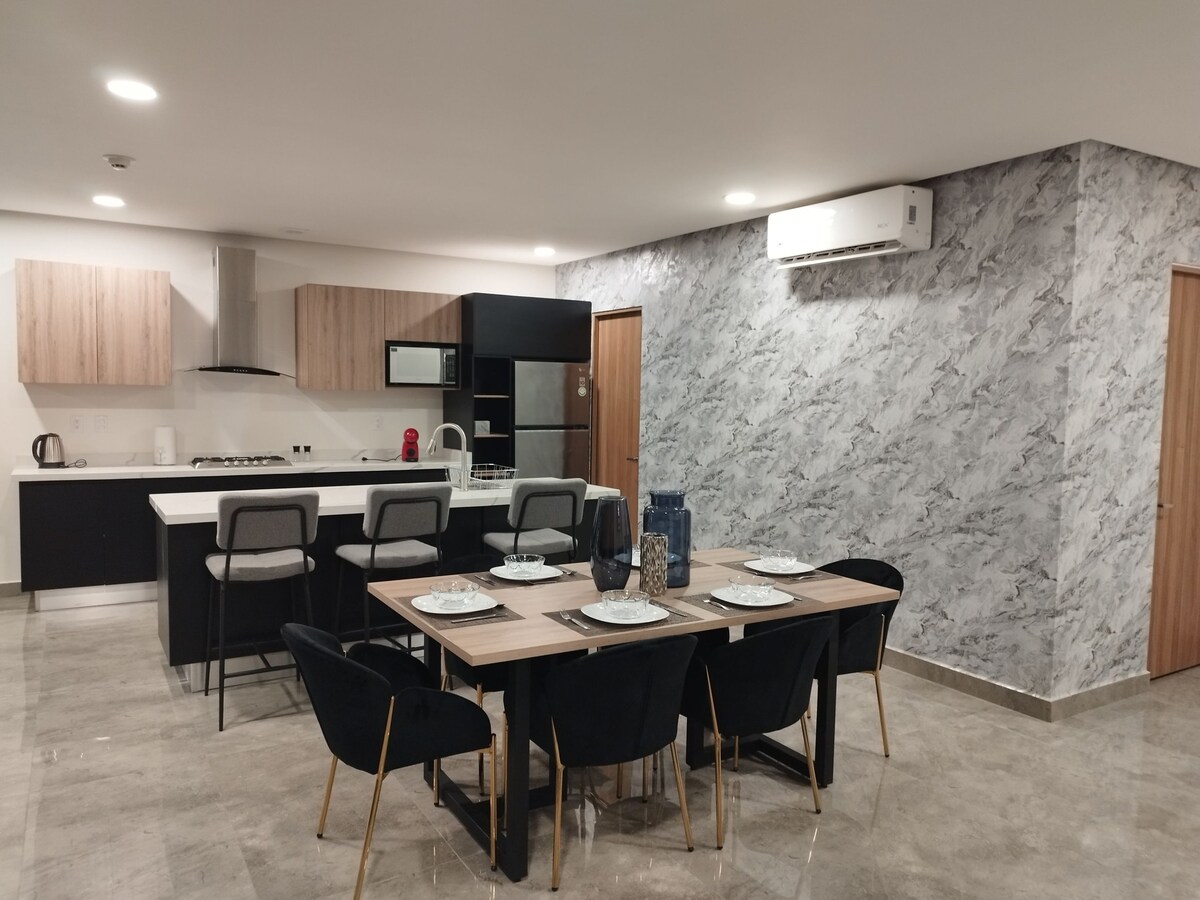 Aeropuerto, Hospital Ángeles, Plaza Ceiba və Costco yaxınlığında, əla yerdə hovuzun qarşısında yeni mərtəbə mənzil: - İki yataq otağı: Əsas çarpayı 150-179 sm-lik çarpayı, ikinəfərlik çarpayı - Tam təchiz olunmuş mətbəx - TV 4K 55" -Qulplu hamam otağı - Hovuz, açıq havada masalar və iş yeri - Paltaryuyan maşın və quruducu ilə kommunal otaq Rahat və komfortlu qonaqlamadan zövq alın. Sizi gözləyirik!