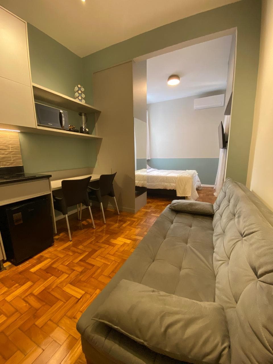 Airbnb Rio-de-Janeyronun ən sakit və füsunkar məhəllələrindən biri olan Flamenqo-Biçdə yerləşir. Ətrafdakı təbiətin heyrətamiz mənzərələri ilə əmlak rahatlıq və praktikadan imtina etmədən dənizə və yaşıllıq sahələrinə yaxın olmaq üçün unikal təcrübə təklif edir. Mənzil bir məkanda yaşayış sahəsi, balaca mətbəx və yataq otağı olan, qonaqpərvər və funksional atmosfer təmin edən vahid mühitə malikdir. Böyük pəncərələr təbii işığın məkanı işğal etməsinə imkan verir.