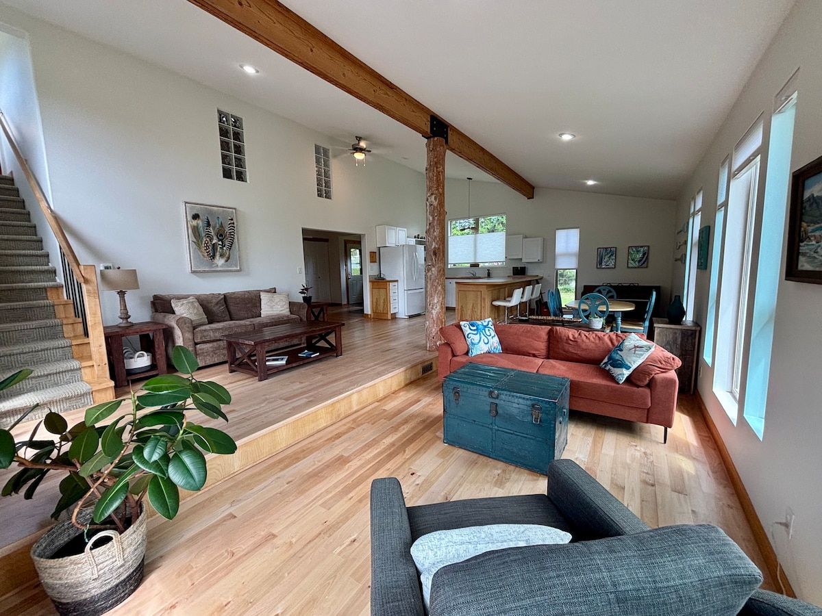 Discover coastal bliss in our West Coast Cottage in Campbell River, just 30 mins from Mount Washington and nestled within close driving distance to Willow Point and downtown. Enjoy breathtaking ocean & mountain views, and wildlife from bald eagles to dolphins. Fire up the BBQ on your private deck, then later come enjoy the common firepit area! The cottage does not have ocean view, however, the waterfront is only 30 meters away on our property.
