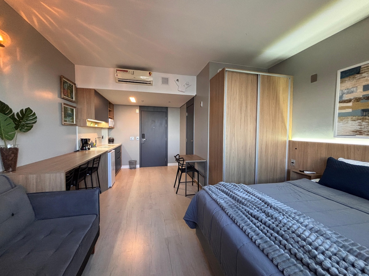 İctimai Mərkəzdə Müasir Stüdyo - Ktba-da rahatlıq, praktiklik və əla mövqe axtaranlar üçün idealdır. Kondisionerli mühit, avadanlıqlarla təchiz olunmuş mətbəx və Smart TV - istirahət və ya iş üçün mükəmməldir. 🛏️ 4 nəfərə qədər qonağı rahatlıqla yerləşdirir, keyfiyyətli yataq dəsti var. • Qızdırılmış hovuz • İdman zalı • Sauna • Terras • Camaşırxana (ödənişli) 🚗 Binada parkinq mövcuddur, gecəlik 35 real Ev sahibinə PIX vasitəsilə ödəniş.