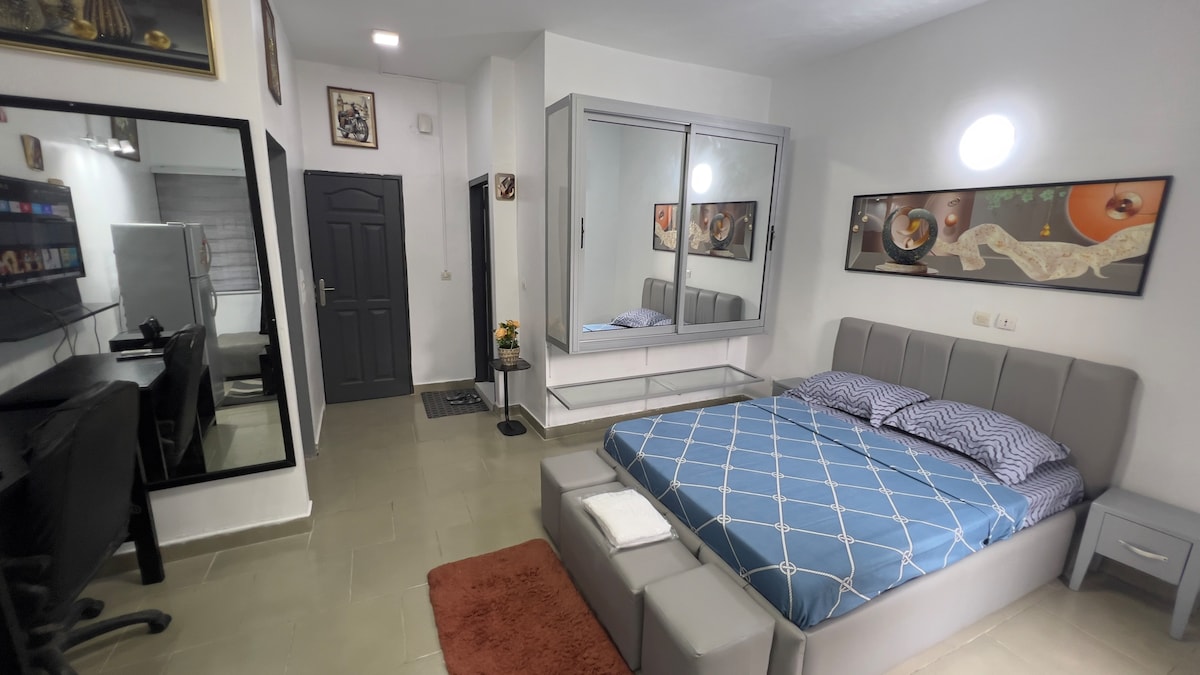 Ce logement parfaitement situé offre un accès facile à tous les sites et commodités. Beau studio meublé, cuisine américaine à 1 minute à pied du centre commercial Yopougon Cosmos. Commodités : Climatisation, micro-ondes, réfrigérateur, gazinière, TV écran plat, Canal, WIFI, chauffe-eau, machine à laver, linge fourni (serviette et draps), service de ménage deux fois par semaine.