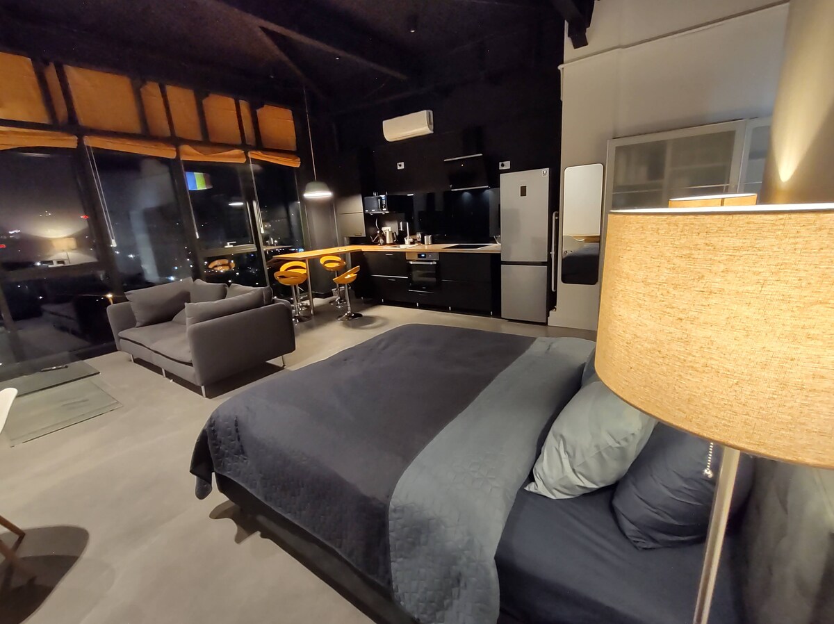 The Sky Loft is an amazing apartment that makes you feel like you're floating above the city! A huge glass wall opens a unique panorama on the entire city. It is located across the street from the Palas District which is the city's business, shopping and entertainment district. The open space apartment with king size bed can accommodate up to 2 people and is intended both for business travelers and as a starting point for exploring the fascinating city.
