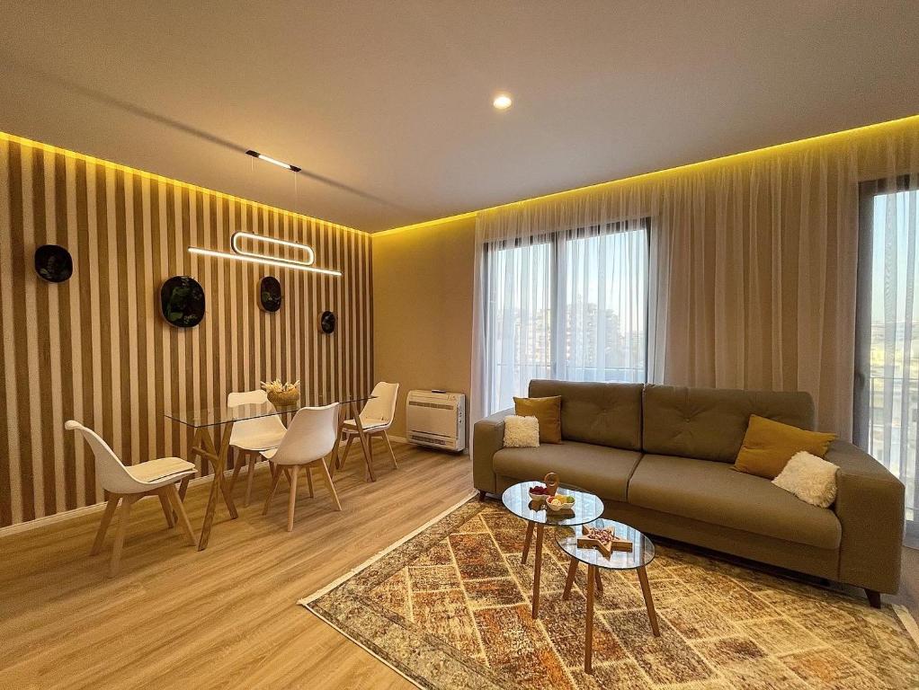 Mənzil zəriflik, sadəlik və son rahatlığa üstünlük verməklə konsept edilib. Otaqları bol təbii işıqla dolduran böyük pəncərələrin təklif etdiyi mənzərəyə baxarkən ailəniz və dostlarınızla keçirdiyiniz vaxtdan zövq alın. Onun rahat mövqeyi Tirananın yeni müasir ərazilərindən birində şəhərin mərkəzi meydanından ayaqla cəmi 10 dəqiqəlik məsafədə xoş təcrübəni daha da artırır.