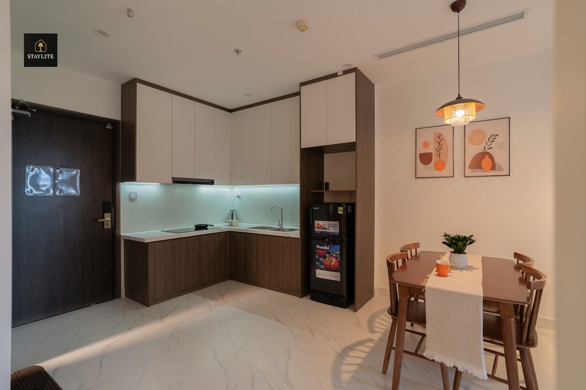 Binanın küncündə mənzil (8-ci mərtəbə). Gecə vaxtı Landmark 81 binasının rəngarəngliyini və şəhər mənzərəsini digər pəncərədə müşahidə edə bilərsiniz. Yaxşı hisslərlə daha çox yeni müsbət təcrübələr gətirsin. - Mənzildə rahat qonaqlama üçün lazım olan hər şey var: rahat çarpayı, soba, çaydan, soyuducu, Paltar qurutma maşını, mikrodalğalı soba, kondisioner, isti su, süd hamamı, şampun, dəsmallar, tualet ləvazimatları.
