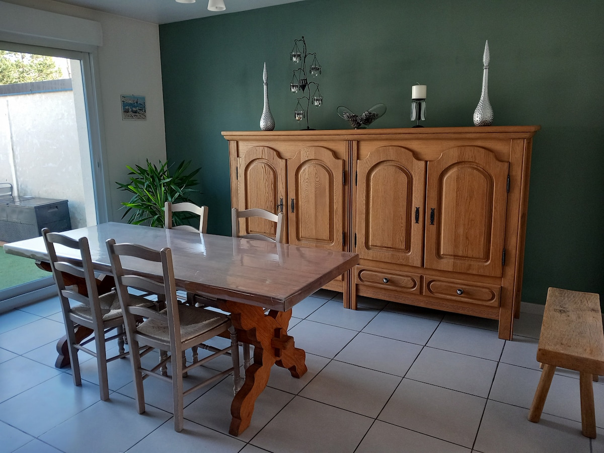 Maison de ville avec terrasse et jardin, située à 10 mn à pied du centre ville, à proximité d'un parc arboré. Maison confortable et idéale pour les voyageurs, mais aussi les travailleurs ... RDC : Salon avec TV et WIFI Salle à manger ouverte sur cuisine équipée . SDB Etage : 1 chambre lit double 1 chambre 2 lits simples sur mezzanine séparée par un rideau. Escalier assez raide pour accéder à l'étage. Lits faits à l'arrivée, tarif pour 4 personnes.