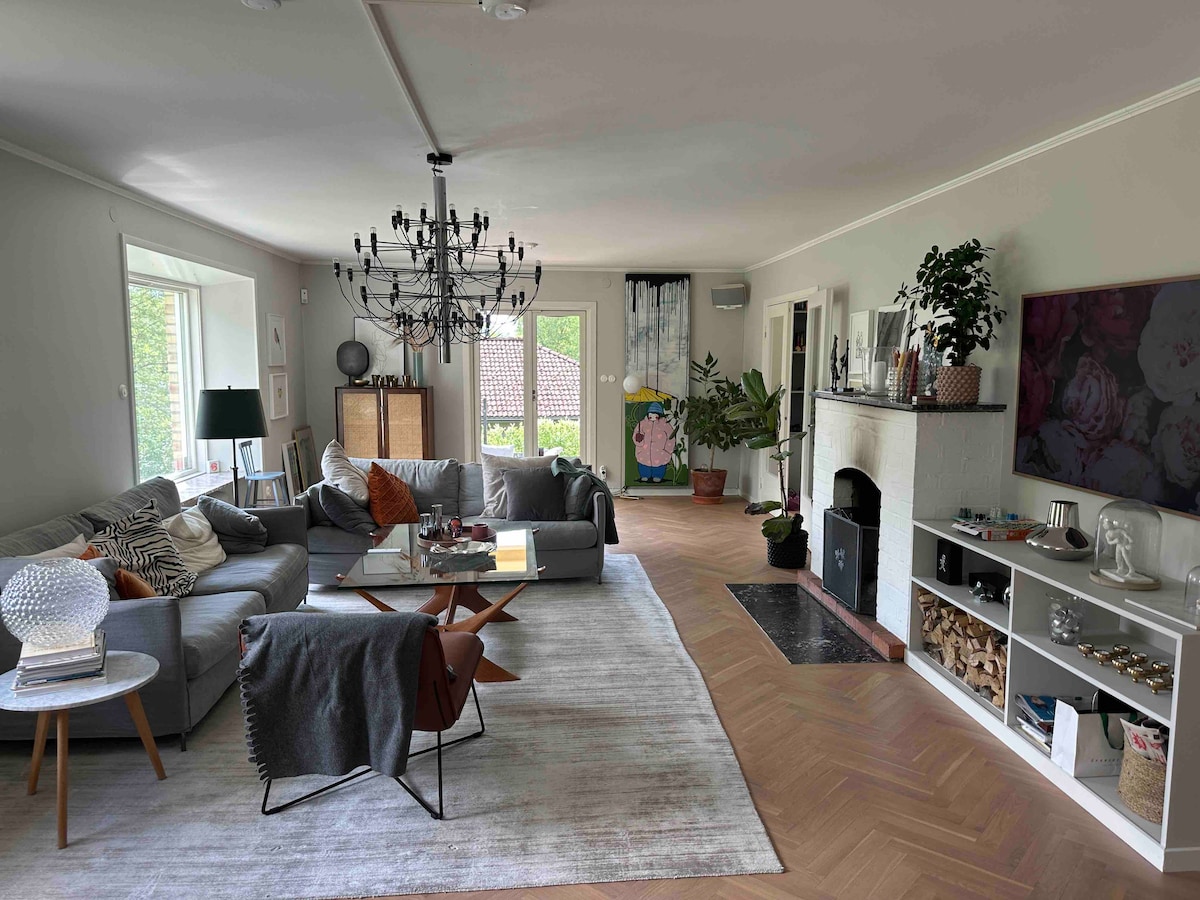 Otuzuncu illərdə tikilmiş rahat evimizə xoş gəlmisiniz. Ev mərkəzi Stokholmdan cəmi 15 dəqiqəlik məsafədə təhlükəsiz ərazidə yerləşir. Ev orijinal təfərrüatlarla birlikdə təzə mebellərlə yeni təmir olunub. Evdə dörd yataq otağı, iki hamam otağı, televizor otağı, sauna və idman zalı var. Bağımızda böyük qızdırılmış üzgüçülük meydançası, bir neçə oturma sahəsi və açıq havada SPA olan veranda tapa bilərsiniz. Ətrafda ekskursiyalar, gəzinti və araşdırma üçün mükəmməl gözəl bir meşə var.