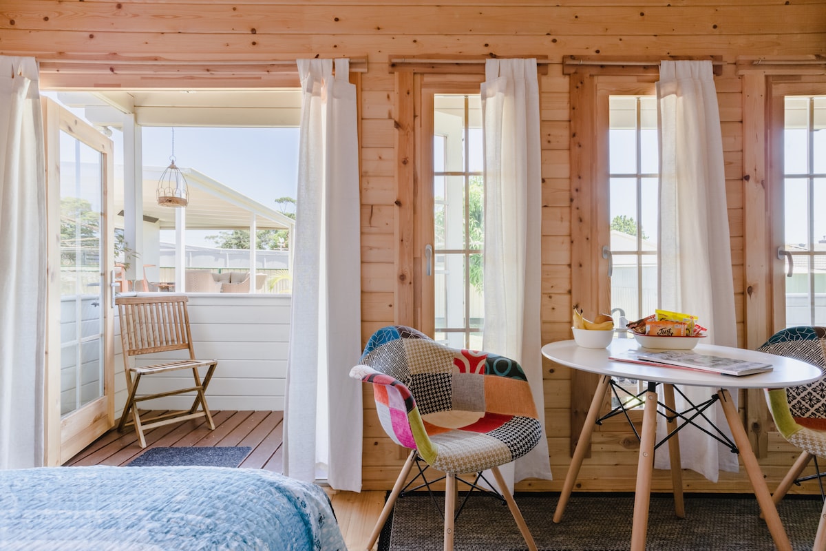 Kokaburra Kabinəmizə xoş gəlmisiniz! Bu, yumşaq Kraliça çarpayısı, Mətbəxi, tam duşu olan vanna otağı, televizoru (Netflix və Disney+ və iki nəfərlik masası) olan studiya kabinəsidir. Kabinə küçə parkinqi və ya arxadan ayrıca yeri olan müəyyən bir evin arxasında yerləşir. Kiçik, lakin qısa qonaqlama, yüngül, rahat və rahat qonaqlama üçün lazım olan hər şey var.