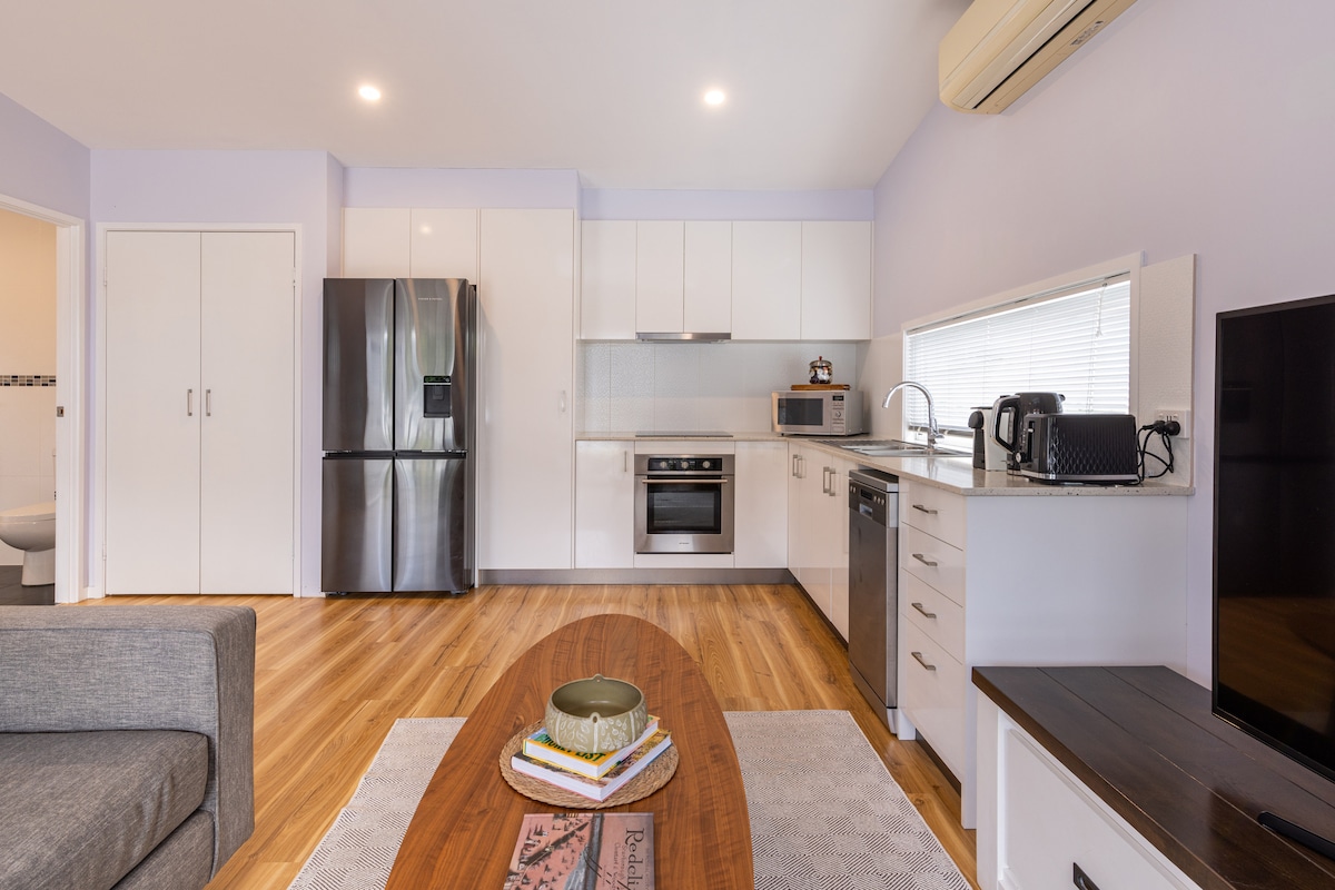 Escape to your private haven on Ellora Street! Our self-contained retreat offers a luxurious bathroom, a cozy queen bed, and a separate dining area. Enjoy sea breezes on the covered patio with a BBQ, and embrace convenience with a washing machine, fridge and small appliances. Your privacy is paramount with a private entry and seamless no-contact check-in. Discover a space where creature comforts and delightful surprises elevate your stay. Note - cooking is outside on BBQ with side burner.