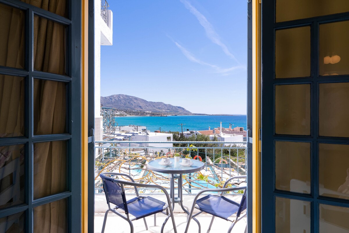 Krit dənizinə baxan geniş terrasa açılan bu 36 kv. metrlik mənzildə ayrıca yataq otağı və soyuducu və elektrik dəstəkləri olan yaxşı təchiz olunmuş mətbəx var. Hər 3 gecədən bir 43 televizor, təhlükəsiz, pulsuz Wi-Fi, bütün otaqlarda kondisionerlər və pulsuz ev təmizliyi daxildir.
