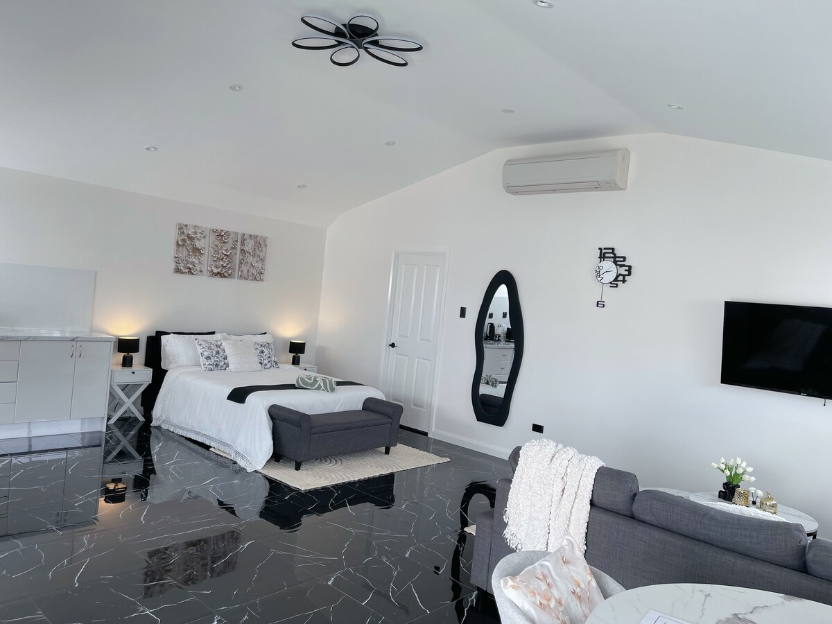 Kraliça ölçüsündə çarpayı, kondisioner və tammetrajlı hamamı olan dəbdəbəli qara mərmər vanna otağının olduğu dəbli, izolyasiyalı tökülən konversiyamıza xoş gəlmisiniz. Rahat yaşayış sahəsinə divan, ağıllı televizor və yemək masası daxildir. Mətbəxdə hava fri, dondurucu bölməsi olan kiçik soyuducu, mikrodalğalı soba, toster, bardaq təklif olunur, lakin soba və ya soba yoxdur. Cütlüklər və ya tək səyahət edənlər üçün ideal olan bu sakit məkan rahat tətil üçün rahatlıq və komfort təmin edir.