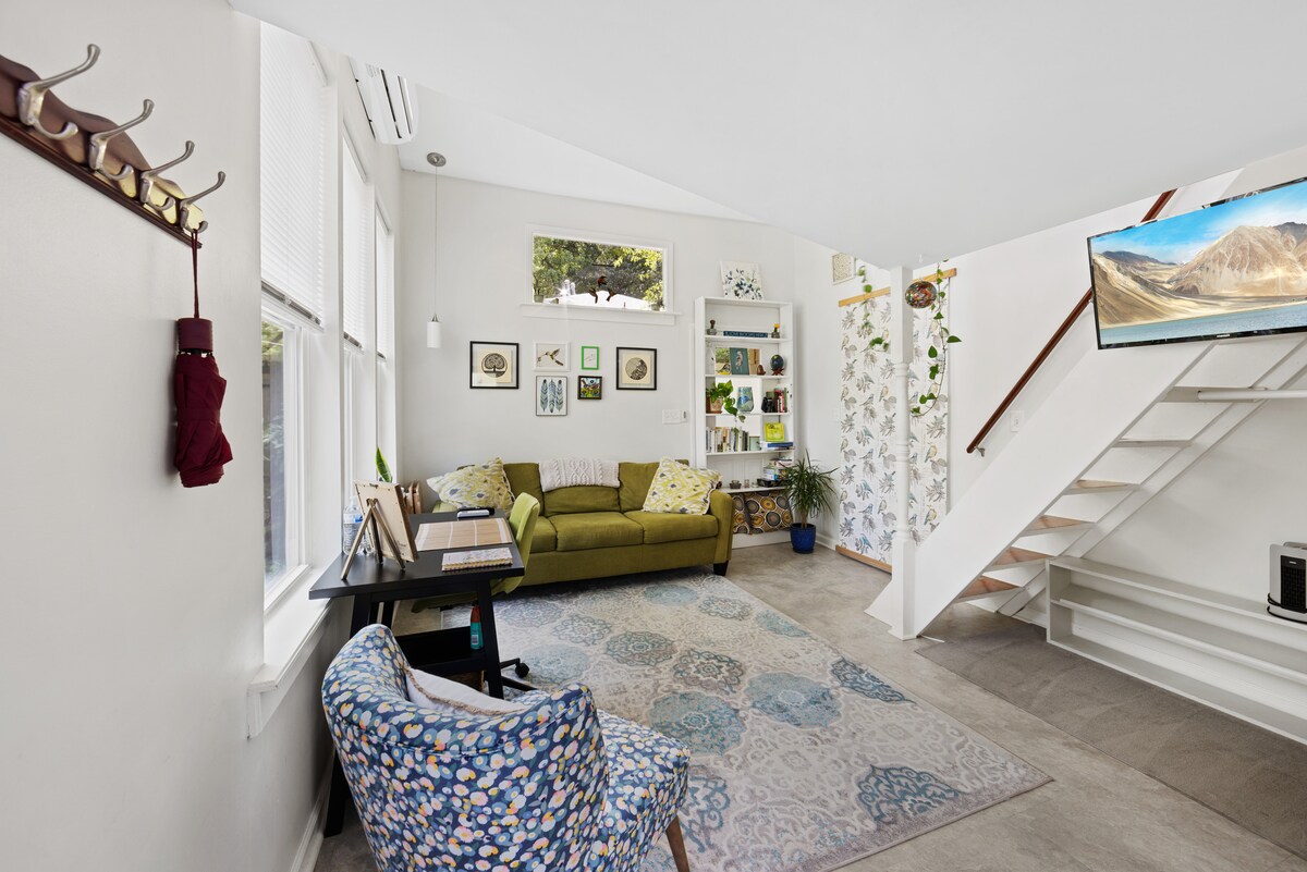 NEW FOR 2026: 50" TV in Bedroom. Shower Shampoo / Body Wash Dispenser NOTE: Guesthouse sleeps 2-3 adults or 2 adults and 2 kids Cozy one bedroom 2nd level carriage house apartment. Secure, gated, off-street parking and coded door for seamless entry. Features include high speed internet, 43" Roku Smart TV, large frameless glass-door shower, Keurig Mini, and all needed amenities for an enjoyable stay. Home is on a quiet street and walkable to park, golf course, and nearby restaurants.