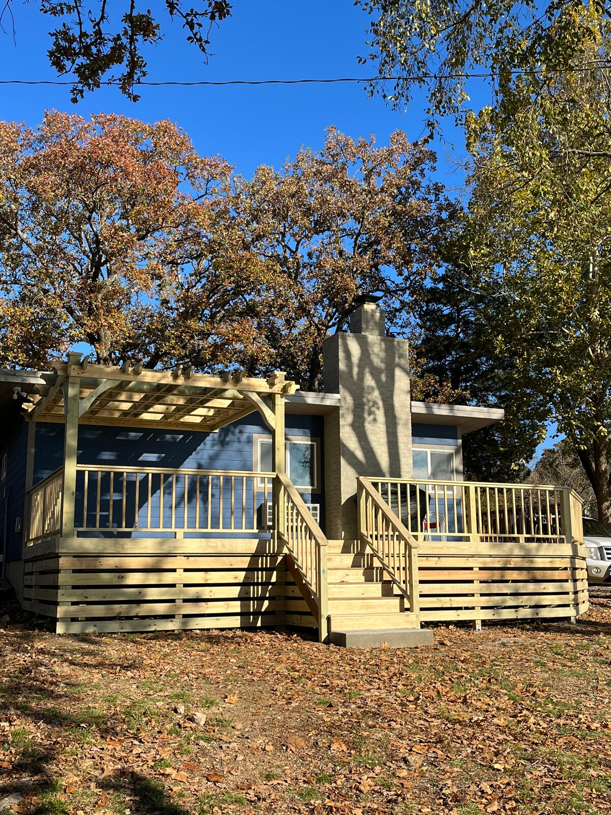 Relax at our family friendly lakefront cabin. Clean and functional living space. Large deck with beautiful views of Grand Lake. Shorefront access with stairs. Enjoy sunrises and sunsets on the deck or in the sunroom. Kitchen is fully stocked with all necessities. Extra linens, towels, and toiletries provided. Gas grill on upper deck. Only a 10 minute drive to Grove, OK. Please note there are several stairs to get up to the cabin itself (it’s how we get such a beautiful view :).