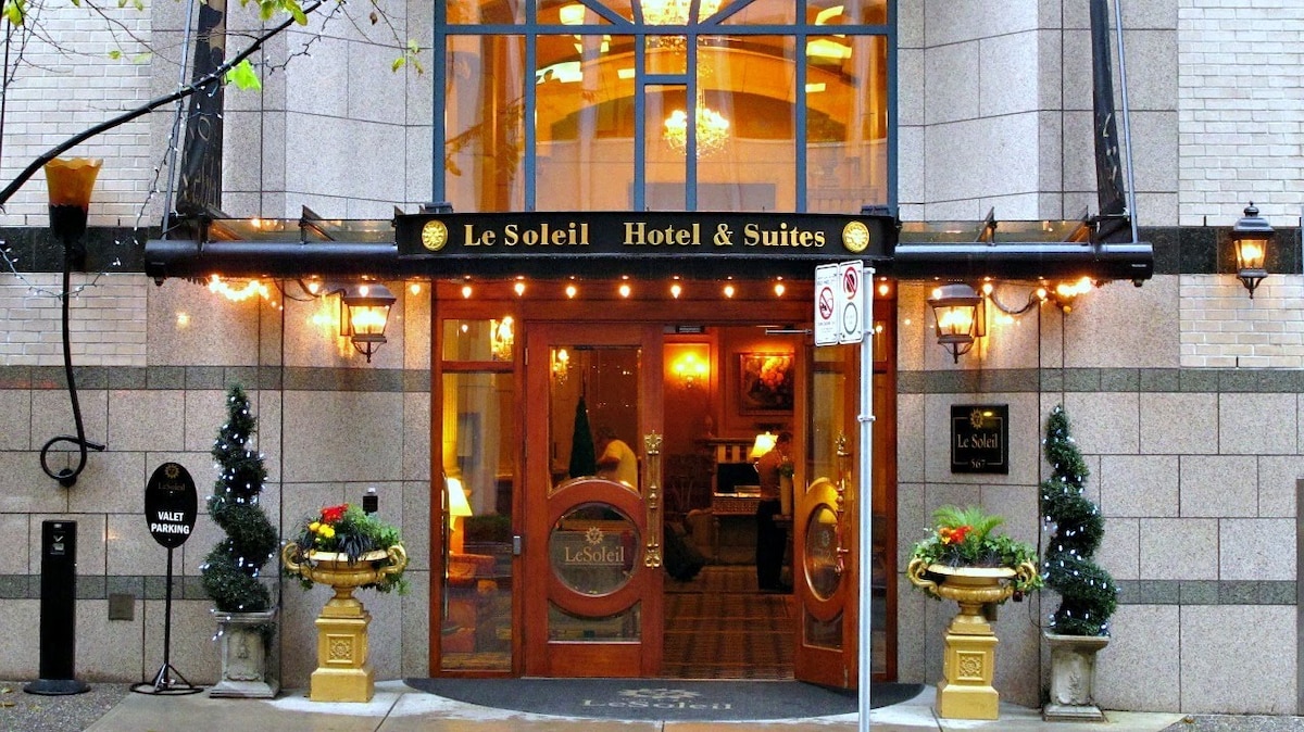Unwind in style at Le Soleil Exclusive Suites, a boutique retreat in the heart of downtown Vancouver. This elegant 1-bedroom suite features a plush king bed, a sofa bed, private bath, and refined décor. Enjoy exclusive hotel amenities—gym, golf simulator, concierge, and on-site dining—while being steps from top attractions, shops, and dining. Whether for business or leisure, this urban sanctuary offers comfort, convenience, and luxury.
