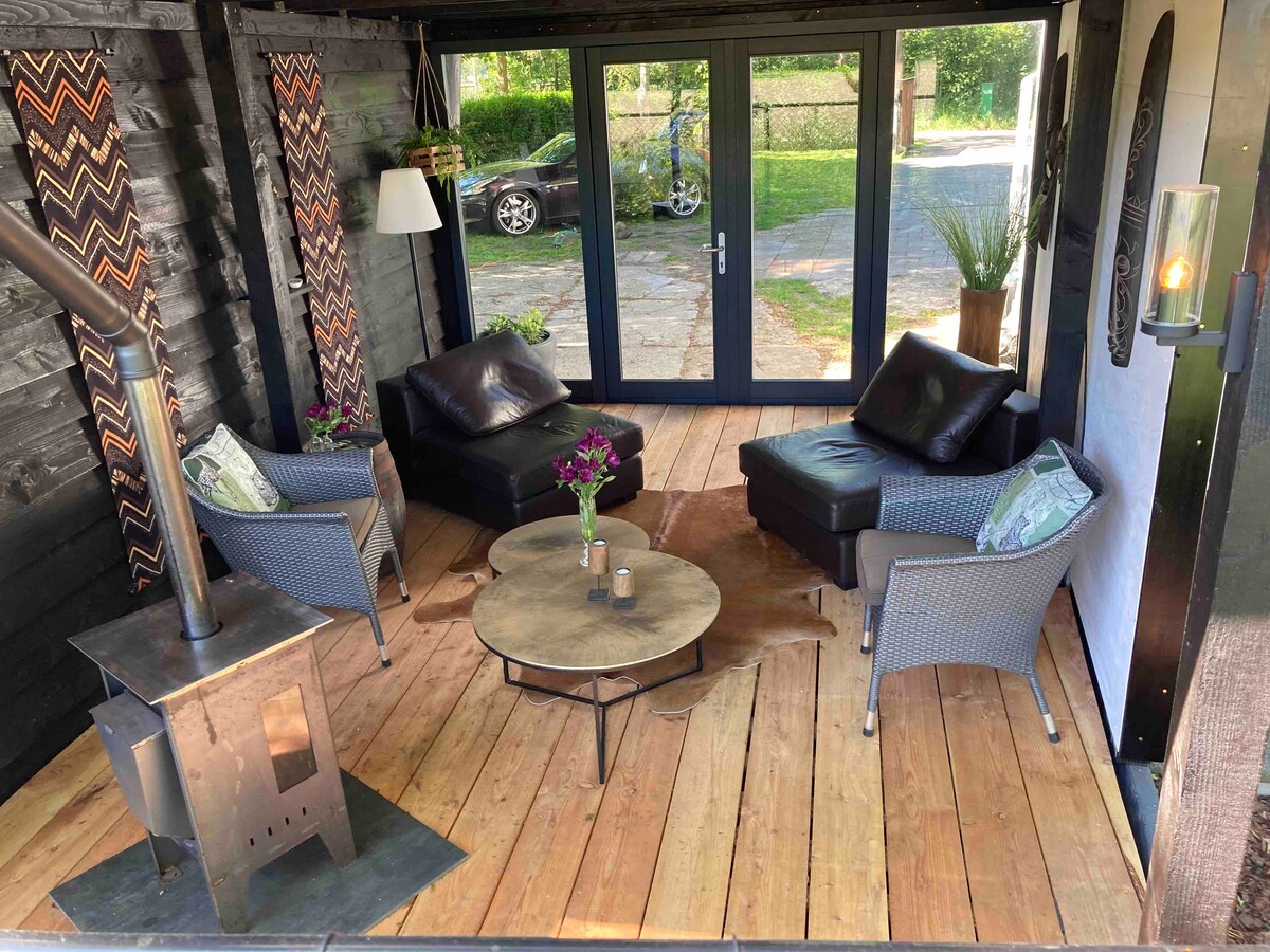 Voel je welkom! Dit ruime buitenhuis met eigen ingang is achter ons huis gelegen (aan de andere kant van onze rijke tuin). ♡ Woonkamer met gashaard, bioscoop, keuken met koelkast/ combi-oven/ waterkoker/ kookplaat, badkamer met o.a. regendouche, een vide met tweepersoonsbed ♡ Ruim terras met parasol, tuinmeubelen en een barbecue ♡ Sauna en hottub tegen bijbetaling (€45) ♡ 15 minuten lopen naar Haagse Markt (restaurants en winkels) 10 autominuten/ 15 minuten fietsen naar het centrum van Breda.
