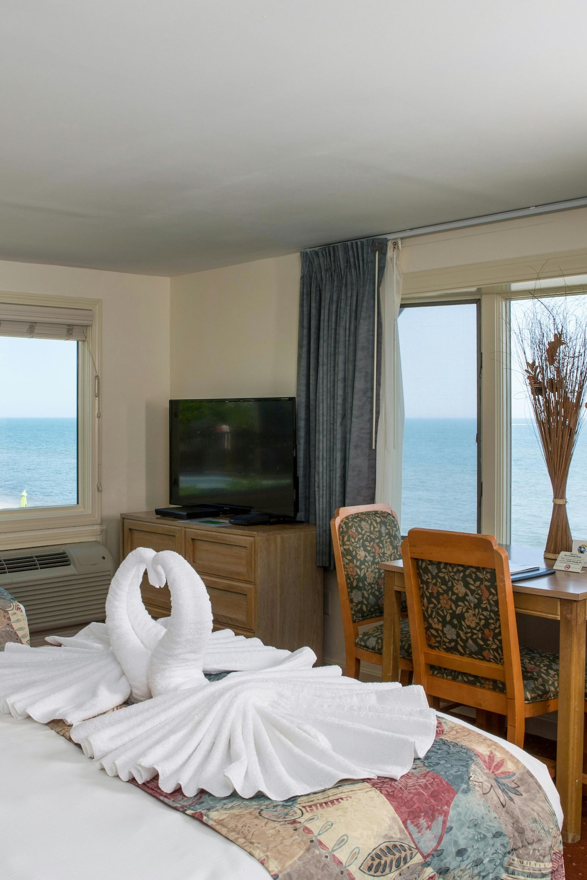 Most Value Rooms have angled ocean views with private balconies and are located on the first or second floors of the Cross Rip building. These are small units (12′ x 14′) that include one queen bed, a full bath with a one-person Jacuzzi jet tub, refrigerator, microwave, coffee maker, small round table with two chairs, 43″ HD TV, A/C and whirlpool bathroom tubs for one. (We have two of these rooms without ocean view with a similar setup.