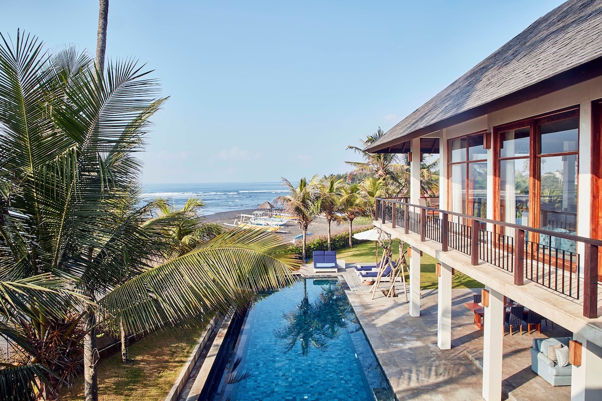 Bali məbədinin yanındakı qara qum çimərliyində dalğaların səsi rahatlayacaq və məftun edəcək. Bu şəxsi villa Hind okeanı, düyü tarlaları və məbədlərlə əhatə olunmuş kiçik yarımadadadır. Müasir Bali memarlığının şah əsəri, Balinin hiss və ruhunu lüks yaşayışla birləşdirir. Bütün 700m2-lik villa sizindir. Yataqdan qırılma dalğalarına baxın! (yuxarı bdrms) Həmçinin gözəl günəş doğuşu, məbədlər, Maunt Aqunq və Nusa Penida. Eyvanlarımız da gözəl məkandır.