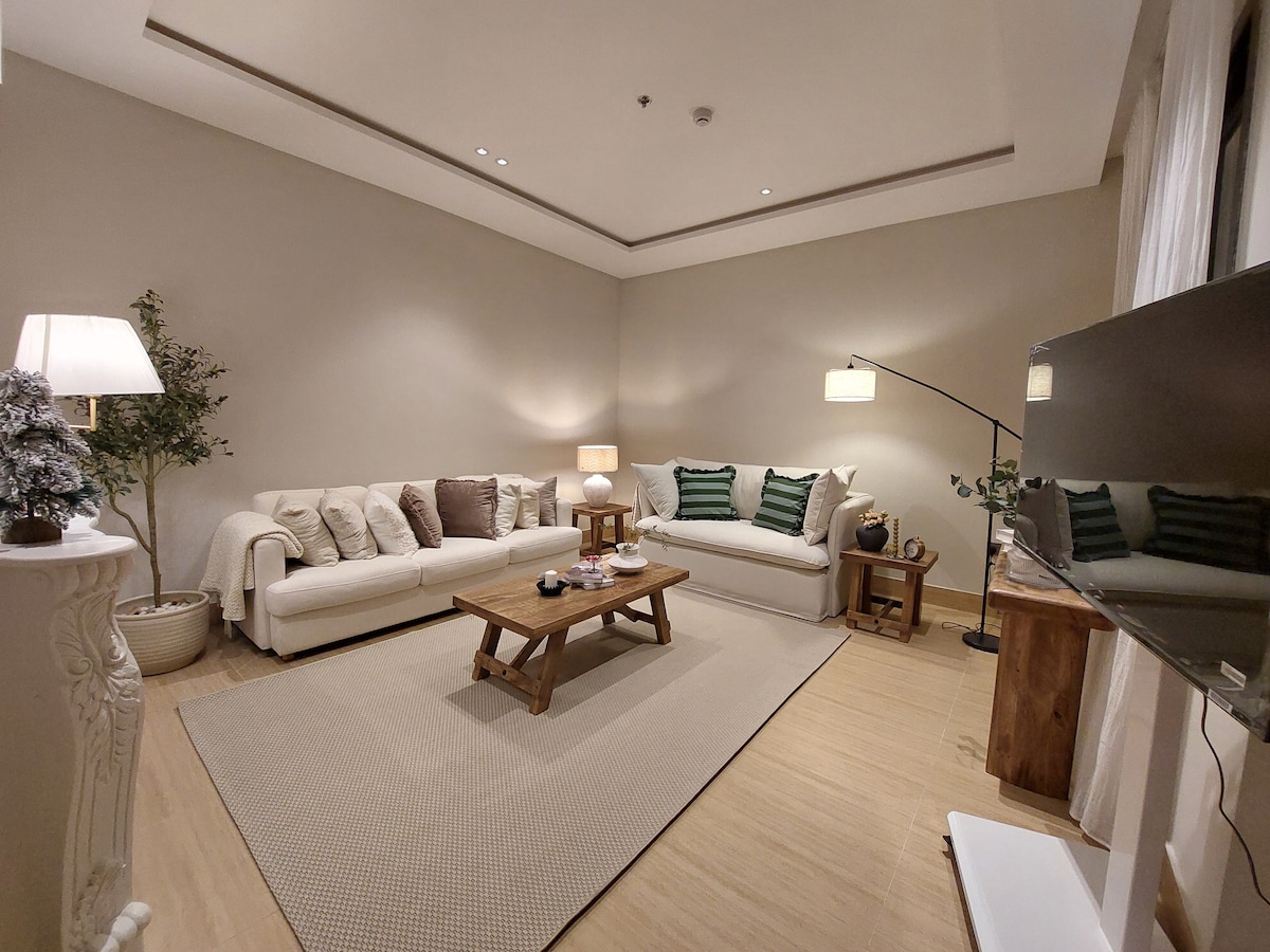 Enjoy the luxurious space of a modern apartment with an attractive view from the bedroom and balcony overlooking the bridge lake, just two minutes from the Bahrain Causeway. Features that complement the comfort of an unparalleled design. New for those seeking tranquility and sophistication with a touch of luxury, beauty, and cleanliness.