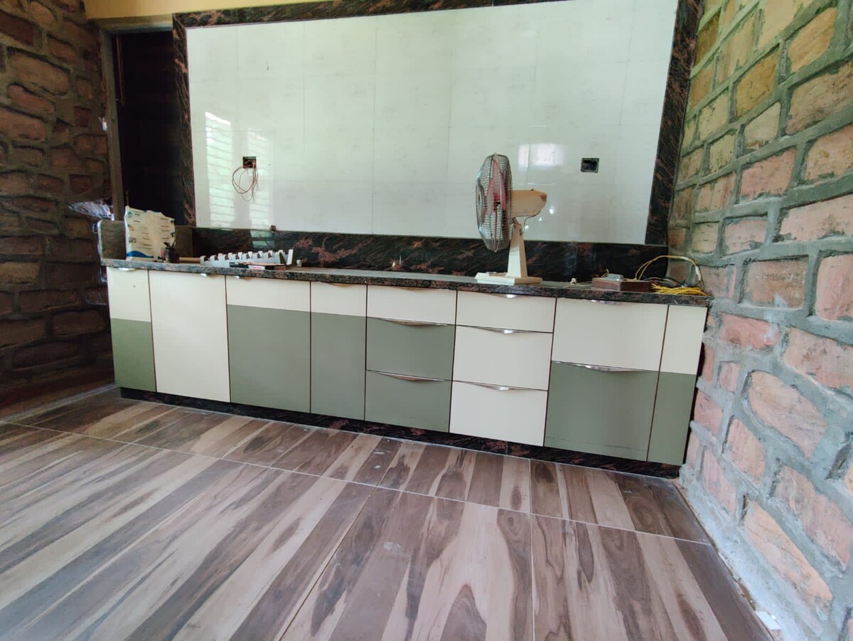 we have all the facilities like..Induction,Plates,Glasses,Bowls,Pan,spoons,Sandwich Toster in Kitchen,Aqua Gard ,Fridge,Ac , 2 Bed Roomes with Bed,2 Bathrooms, Dining table, Sofa and 24 hour water.. Bring the whole family to this great place with lots of room for fun.