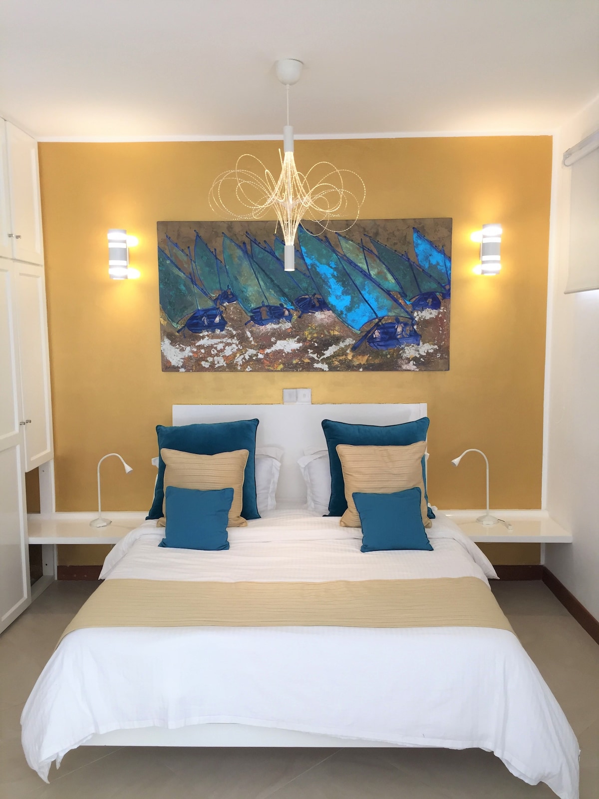 Welcome to The African Art Loft! This penthouse space was just completed in December 2019 and is brand-new. As the sister property to The African Art Suite, The African Art Loft is located in the same compound, offering a modern, airy holiday space. Adorned with original art pieces from The Diani Beach Art Gallery and modern designer furniture, the cosy living space and 26sqm private rooftop verandah offer you a luxury holiday retreat close by the beach.