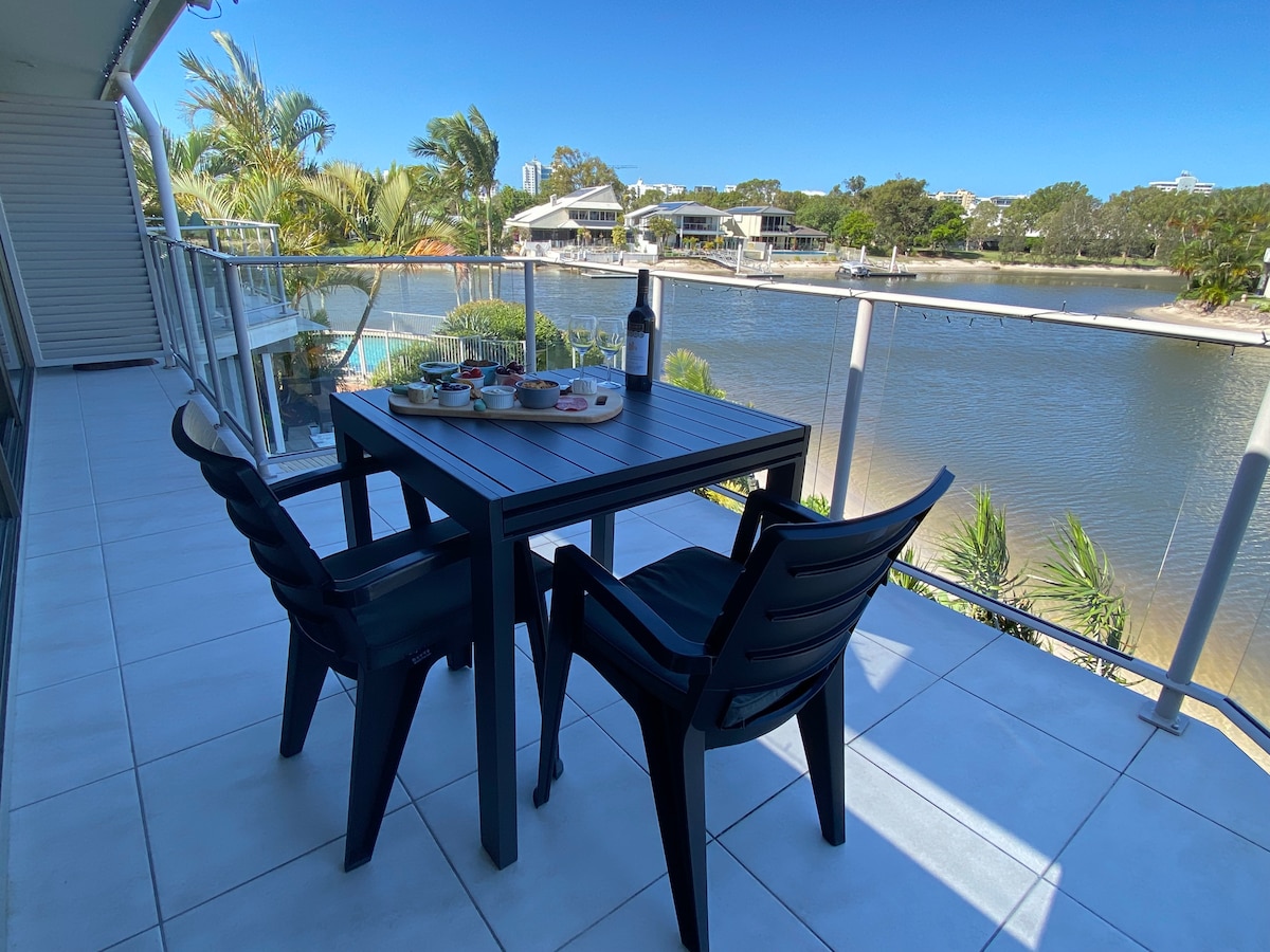 Bayramımıza xoş gəlmisiniz! İstirahət zonasından, yataq otağından, mətbəxdən və ya balkondan gözəl su mənzərələrinə baxan bu işıqlı və geniş mənzildə dincəlin və dincəlin. Gözəl hovuza dalın, şəxsi çimərliyinizdən kayakla gəzin və ya Mooloolaba Esplanade boyunca bir çox kafe və restoranlara gəzintiyə çıxın. Həmçinin qurğu kanallı A/C, tavan ventilyatorları, tam təchiz olunmuş mətbəx, dəbdəbəli çarpayı, Nespresso qəhvə maşını, daxili camaşırxana, Veber Barbekü, 2 Kayak və s. təklif edir.