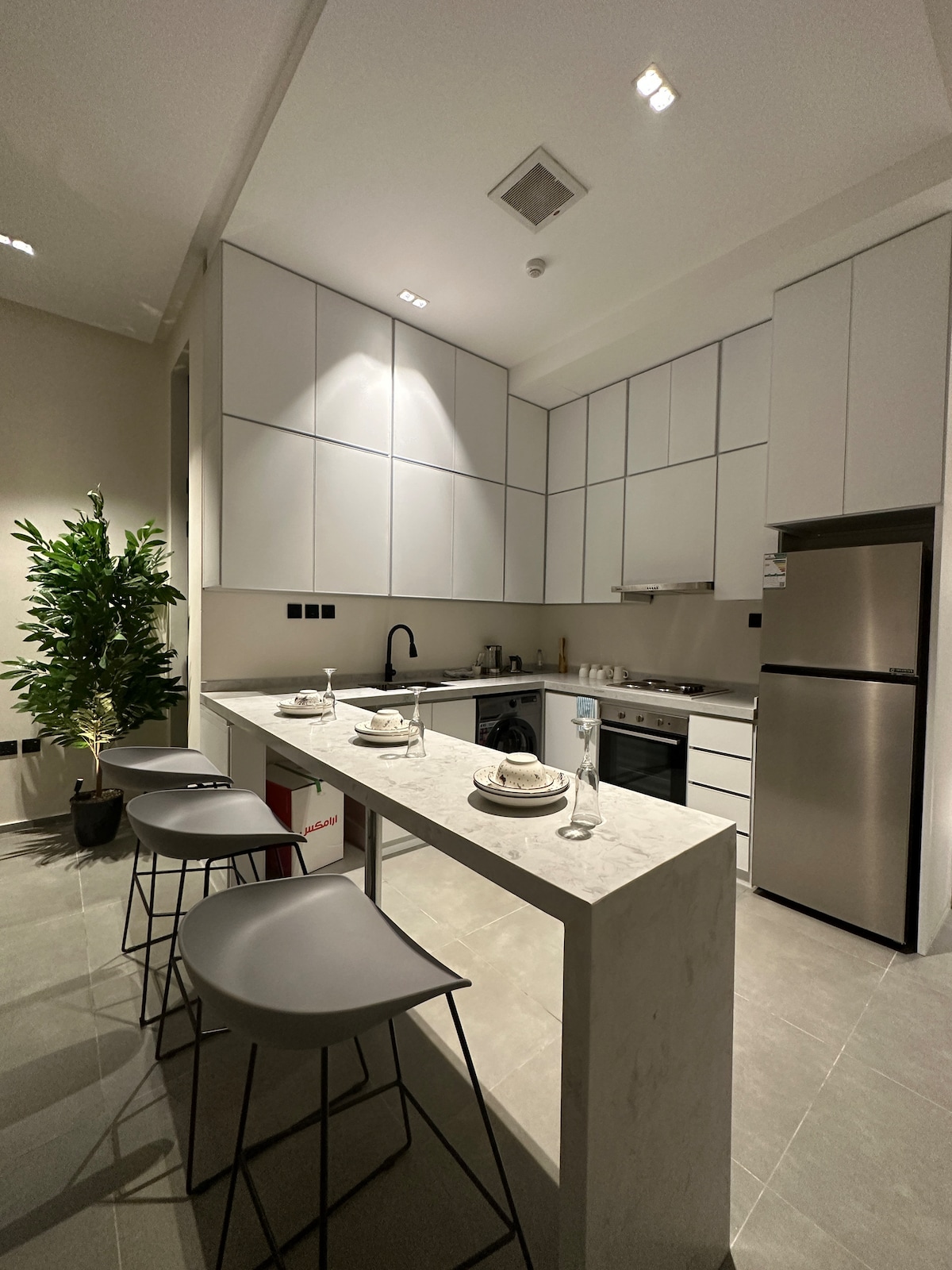 Ər-Riyadın ən gözəl yerlərindən biri olan Hittində, Boulevard City-dən və ən yaxşı kafelərdən bir neçə dəqiqəlik məsafədə yerləşən müasir 1 otaqlı mənzil. Öz-özünə giriş və tam ağıllı sistem ilə rahatlıq və asanlıq üçün dizayn edilib. Rahat yaşayış sahəsi, komfortlu yataq otağı, 85 düymlük Smart TV və rahat atmosfer üçün zərif elektrikli buxarı var. Soba, mikrodalğalı soba, elektrikli plitə, qabyuyan maşın və paltaryuyan maşın ilə tam təchiz olunmuş mətbəx. Təmiz, dəbli və cütlüklər, işgüzar səyahətçilər, eləcə də qısa və ya uzunmüddətli qonaqlamalar üçün idealdır.