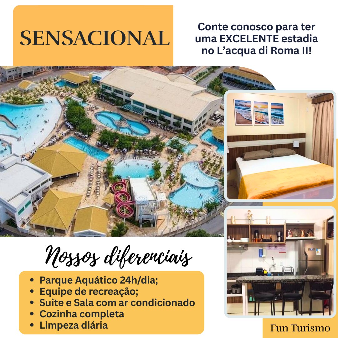 Nice apartment with: Air-conditioned room, bathroom, queen bed plus single bed. Living room with sofa bed and single bed. Conjugated kitchen w / A. Service and 1 parking space. Holds up to 4 adults and 1 child up to 10 years The condominium offers a complete structure of thermal water pools, hot tubs, saunas, showers, wet bar, monitored recreation, sports court, playroom and games room. Guests get discounted admission to Di Roma Acqua Park