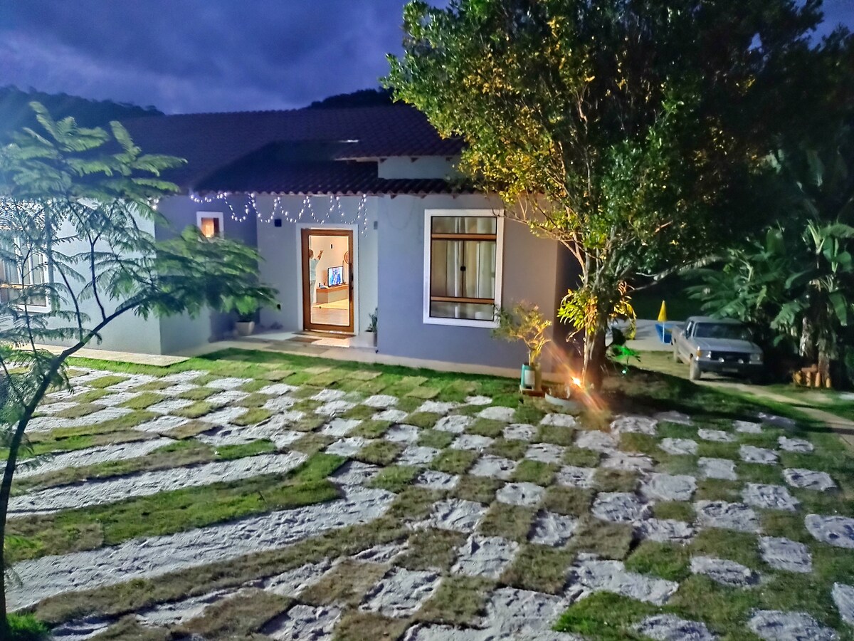 🏡 Arxa planda şəlalə və su səsi olan gözəl kərpic ev, təbiətlə əlaqə və sükunət axtaran cütlüklər, ailələr və dostlar üçün idealdır. Hamısında çarpayılar, qızdırıcılar və ventilyatorlar olan 3 yataq otağı (1-i hamam otaqlı) var; 2-sində meşəyə baxan eyvanlar var. 📍Yer: Parajudan 7 km, Mareçal Florianodan 14 km, Rua de Lazer de D. Martinsdən 17 km və Pedra Azuldan (R. do Lagarto) 22 km məsafədə. 🍔 Barbekü qril, böyük masa, Smart TV, istilikli su və piramida qaz qızdırıcısı olan açıq hava qastronomiya sahəsi.