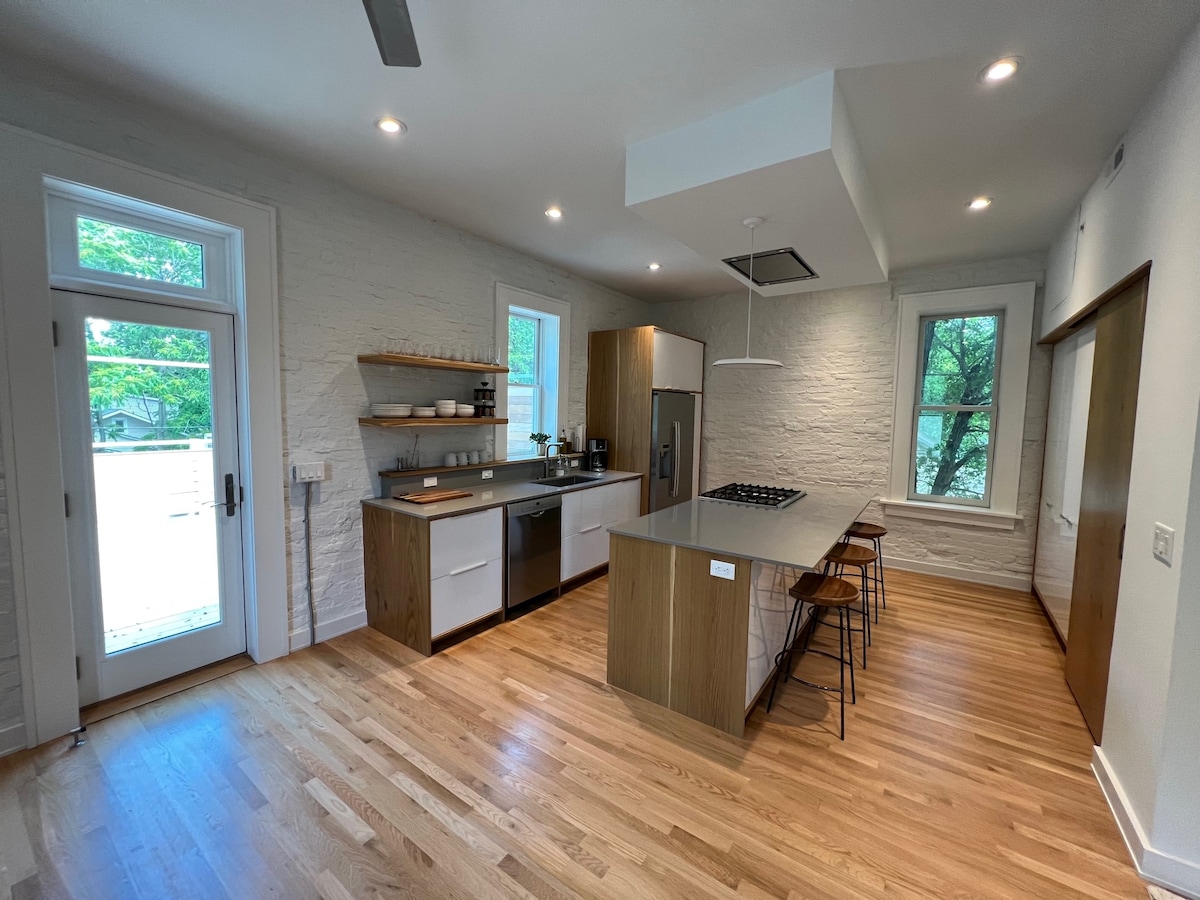 KU və Mass Street/downtown yaxınlığında əla yerdə valehedici, komfortlu mənzil. Tennis və basketbol meydançaları olan parka piyada məsafə və Allen Fieldhouse-a 15 dəqiqədən az məsafə! Qonaq otağı, mətbəx, yemək otağı və camaşırxana, eləcə də 2 yataq otağı və hamam otağının üstü də daxil olmaqla iki hekayənin genişliyindən zövq alın. Super yüksək sürətli internet və Apple TV internet və əyləncə ehtiyaclarınız üçün hazırdır.