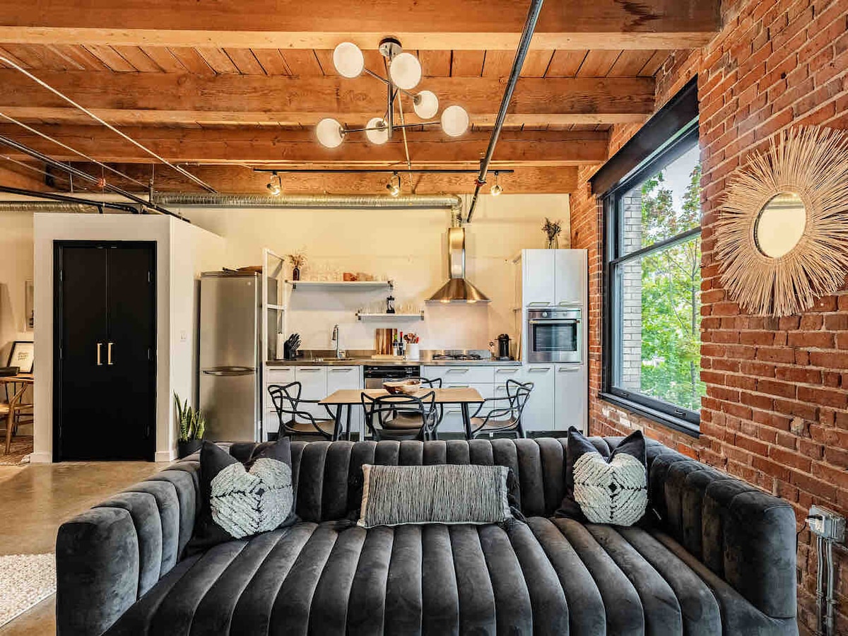 Welcome to this stylish, mid-century heritage loft in downtown Vancouver's Gastown! This space is equipped with a lux King Bed, 55 Inch Smart TV, great WIFI, desk for home office, fully stocked kitchen, huge walk in shower, and more! An open concept 670 sq. ft loft, enjoy this space as your home away from home designed with modern comforts and style!!