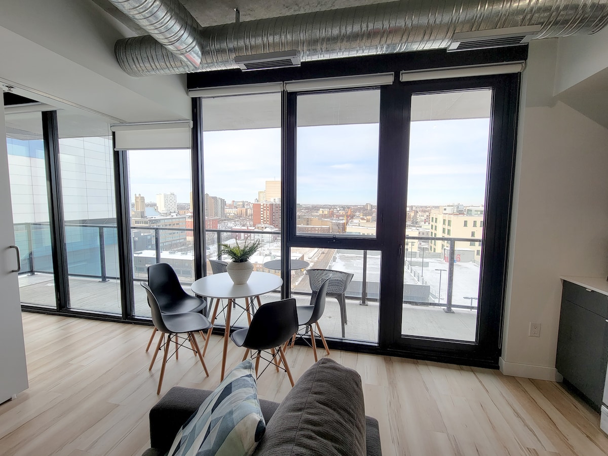 A modern, high-ceiling loft designed for comfort. Fully equipped, well prepared, and welcoming year-round. FREE PARKING with 24/7 security on site INCLUDED! Steps to Jets Arena, Historic Exchange District, The Forks. Direct skywalk access to ALT Hotel, The Merchant Kitchen, Brown’s Social House, and Tim Hortons. The Health Sciences Centre is just minutes away. ⚠️ Building security patrols all floors, with cameras in elevators and hallways, and strictly enforces quiet and rules.