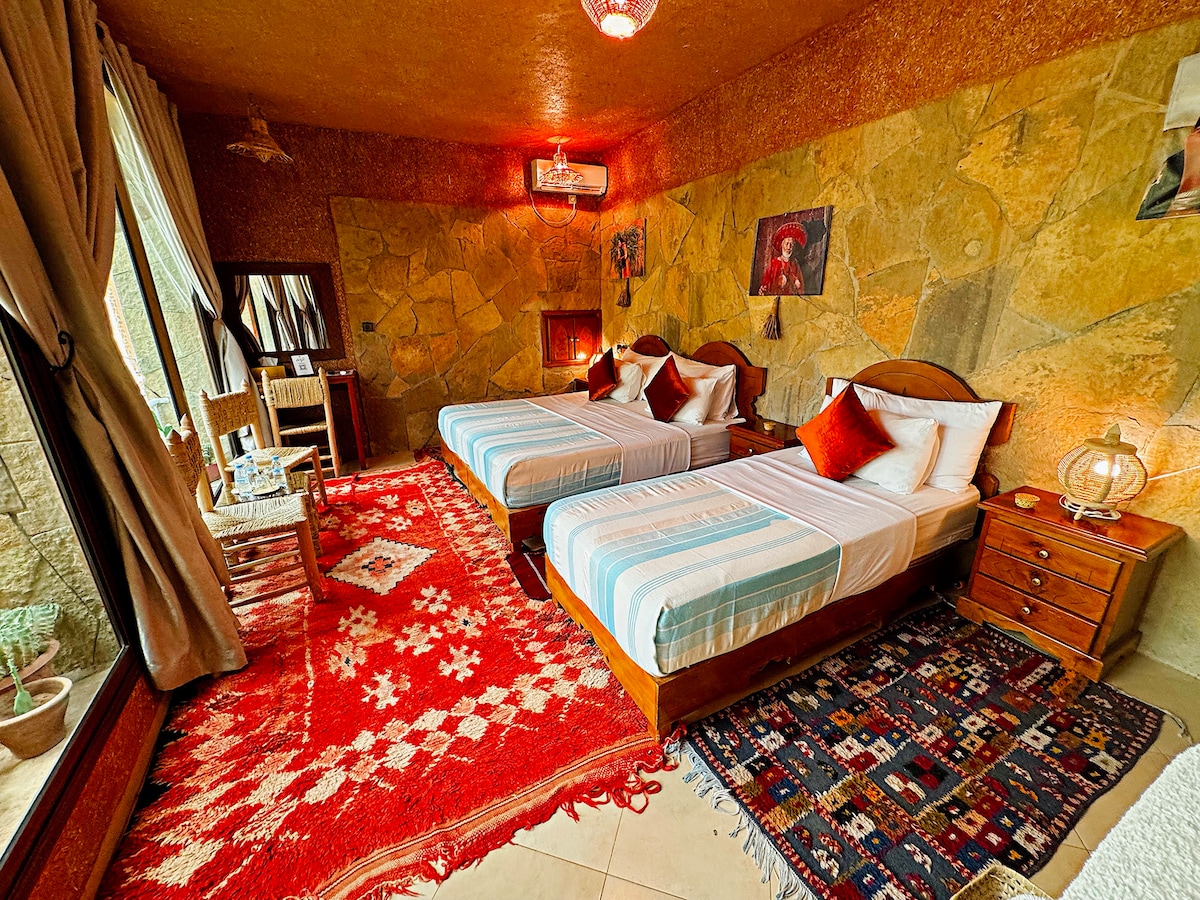 20 ildən çox yaşadığım Amazon ənənələrinin kiçik bir kəndinin mərkəzində səssizlik və gözəllik adası. Yuda Bağı mənim evimdir - ətrafdakı qayalı vadilərdə gəzinti üçün ənənələrin kəşf edilməsi (çörək bişirmək, yemək bişirmək, xalça toxunmaq, torpağı işlətmək...) üçün çəkilmə, istirahət və şəfa anı üçün ideal bir yerdir. Ait Ben Haddou ksar-a yaxın - ehtiyac olarsa, taksi ilə əlçatan ola bilərsiniz. Səhər yeməyi daxildir. Sorğu əsasında yemək yeyin.