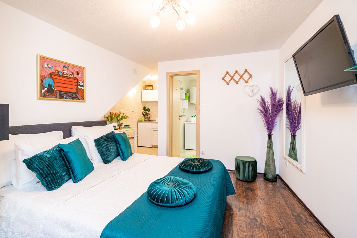 Mənzil Sunset Beach-dən 150 m məsafədə yerləşir – Dubrovnikin ən məşhur çimərliklərindən biri və avtobus dayanacağından 100 m məsafədə yerləşir. Burada birbaşa avtobusu tuta və 10-15dəq. Bir yataq otağı kraliça böyüklüyündə çarpayı (160×200sm), çay/qəhvə hazırlanması üçün kiçik sahə (kiçik soyuducu daxildir) və duşlu bir vanna otağından ibarətdir. Olduqca yaşayış massivində yerləşir. PULSUZ parkinq yeri və pulsuz Wi-fi təmin edilir.