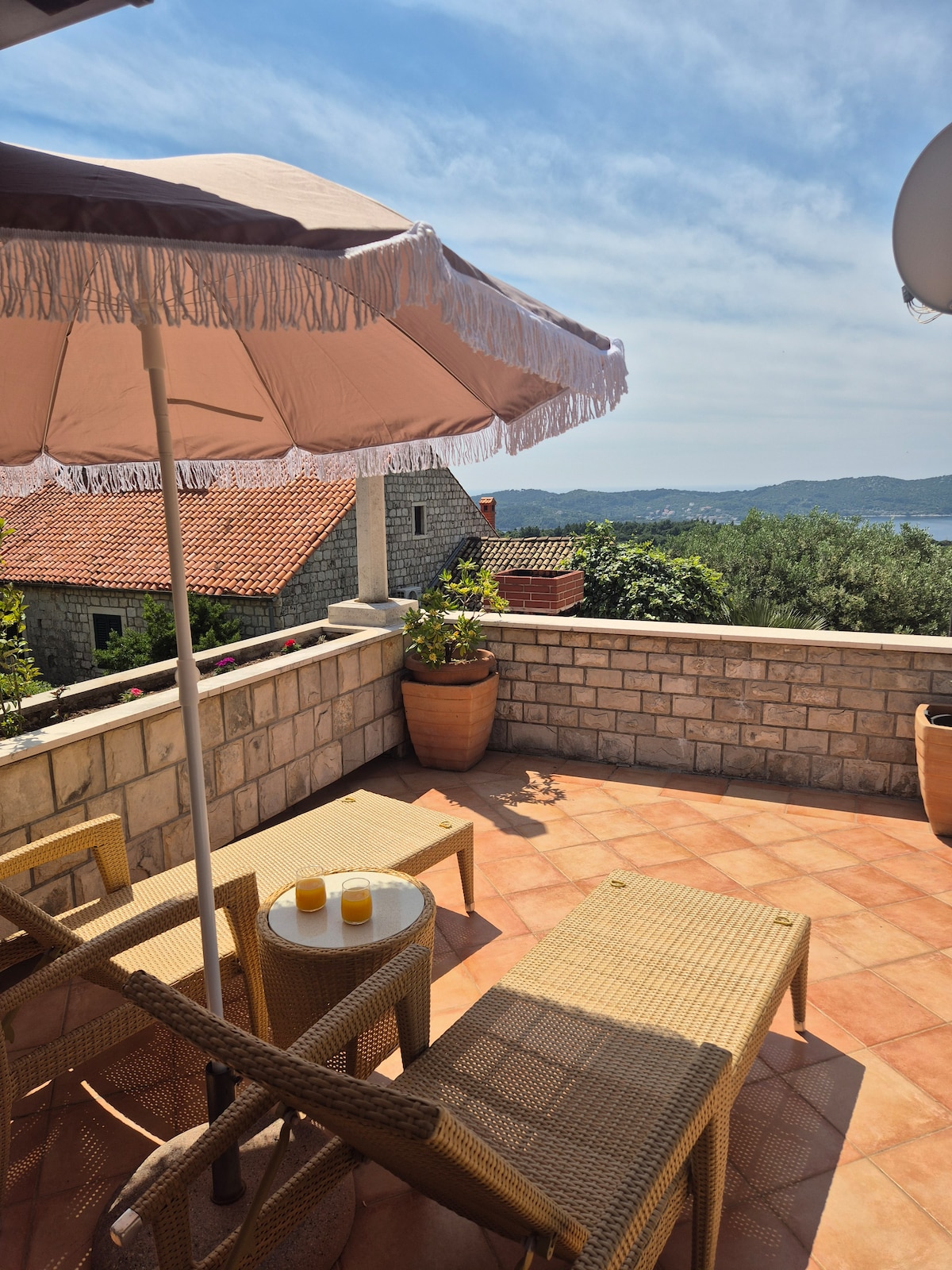 Mənzil İçərişəhərdən 15 dəqiqəlik məsafədə, daşlı çimərliklərlə əhatə olunmuş, yüz metrdən az məsafədə yerləşir və 200 m ətrafında çınqıllarla əhatə olunub. Zeytun ağacı və Perqola kölgəsində kiçik terras, Çiçək bağı, zir-zibil sahəsi ... Çox kiçik ayrı otaq ilə əlaqədar olaraq, mənzil iki böyük və ya iki uşaqlı ailə və ya çarpayıda yatmağı düşünməyən gənc üçün idealdır.