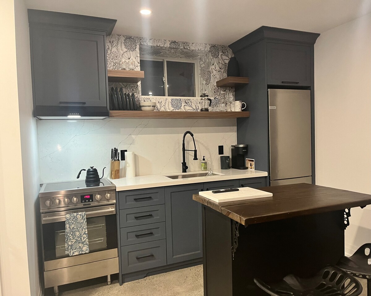 Açıq kərpicdən tutmuş orijinal sənət əsərlərinə, ikiqat boşluğu olan böyük ayrıca hamam otağına qədər evimizdəki bu zirzəmi süitası təmir edilib və loft kimi hiss etmək üçün bəzədilib. İkinəfərlik çarpayı əla gecə yuxusu təmin etmək üçün 16"döşəklə yenidir. Siz antik dik pianinodan yenilənmiş unikal mantiya üzərində istirahət edən yeni, 42" ağıllı televizor, eləcə də konveksiyalı soba/hava fri, Keurig qəhvəxanası və paslanmayan poladdan mini soyuducusu olan balaca mətbəx tapa bilərsiniz.