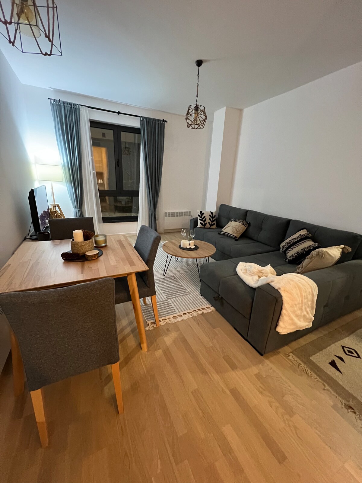 Rahat mənzil xoş qonaqlama üçün lazım olan hər şeyi təklif edir. Qonaqlarımızın hər tərəfini düşünmüşük, buna görə də böyük və qarışıq çarpayı, kabel televiziyası və WiFi ilə rahat oturma sahəsi, tam təchiz olunmuş mətbəx və hamam otağı təmin etdik. Udoban i moderan apartman može da ugosti do 4 osobe i sastoji se od spavaće sobe sa velikim i udobnim krevetom, dnevnog boravka sa ležajem na rvlačenje, potpuno opremljene kuhinje, trpezarije i kupatila. Apartman posjeduje kablovsku TV, klimu i WiFi.