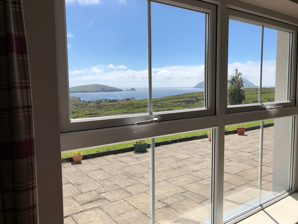 Dinql yarımadasındakı Böyük Bulanıq Adadan görünən dəniz mənzərələri. Möhtəşəm Qartal dağı 🦅 mənzərələri . Aydın gecələrdə ⭐️ görüləcək ay 🌓 və çəkiliş ulduzu! Bütün modifikasiyalar, peyzaj TV, airbnb, Dvd, Sürətli Wi-Fi, Aleksa ilə gözəl geniş lüks ev. Rayan 's Peak & Uzaq və Uzaq Məsafə üçün film məkanı. Ulduzlu Maykl Skellig-ə baxın təpədə gəzinti, balıq tutma, iriş musiqisi, pablar, yerli yemək və mədəniyyət Sadəcə istirahət edin və Atlantik okeanının mənzərələrindən zövq alın!