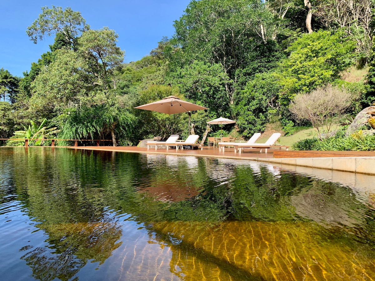 Cuiabá vadisində imtiyazlı mənzərəsi olan, gözəl, tam təchiz olunmuş, yüksək təmizlik standartı, sevgi və fədakarlıqla hazırlanmış hər bir detala qulluq edən evi xəyal edin. Quşların səsinə oyanmaq, mütləq sükut və sülh içində yatmaq istəyirsinizsə, bu, icarəyə verməli olduğunuz evdir. Evdə 2 100 Meqa lifli wifis, 2 tam təchiz olunmuş mətbəx, taxta soba, elektrik və qaz sobası var. Beş süita, cakuzi , sonsuzluq hovuzu (bu il tikilib) və sauna .