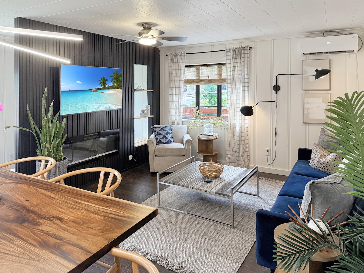 Our newest AirBNB, The Caul House, at The Porches West packs all of the features into its 1 bd, 1 bath floor plan. Open the oversized front door to the high ceilings and spacious living area. The kitchen, full of smart appliances, has a large quartz topped island. The home is outfitted with a stacked washer and dryer making laundry during your stay a breeze. Covered parking off of the back means stress free packing and unpacking during your getaway. Brand new park right outside of your back door